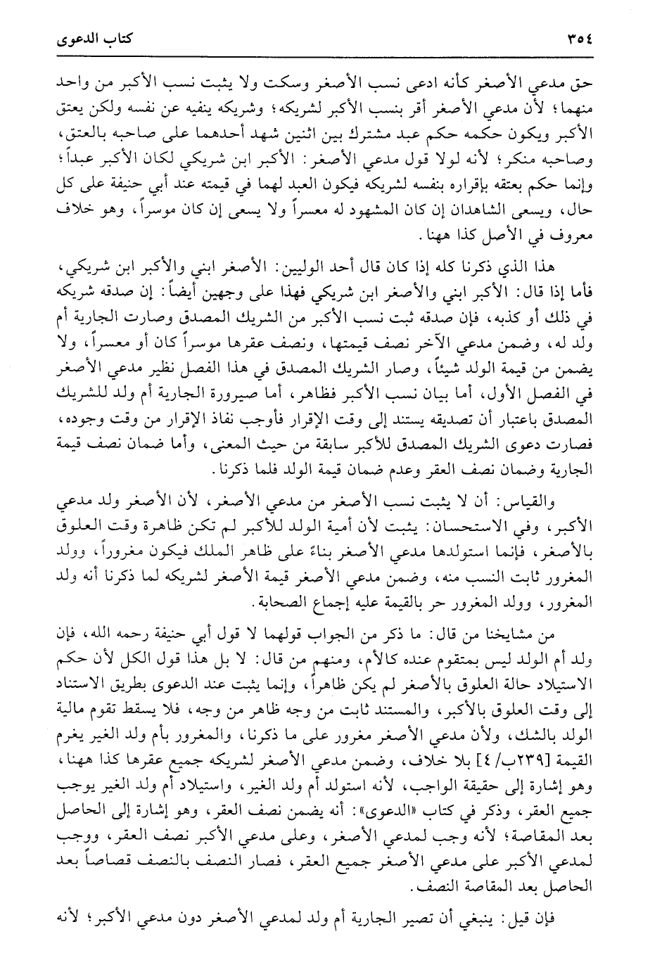 حق مدعي الأصغر كأنه ادعى نسب الأصغر وسكت ولا يثبت نسب الأكبر من واحد منهما؛ لأن مدعي الأصغر أقر بنسب الأكبر لشريكه؛ وشريكه ينفيه عن نفسه ولكن يعتق الأكبر ويكون حكمه حكم عبد مشترك بين اثنين شهد أحدهما على صاحبه بالعتق، وصاحبه منكر؛ لأنه لولا قول مدعي الأصغر: الأكبر ابن شريكي لكان الأكبر عبداً؛ وإنما حكم بعتقه بإقراره بنفسه لشريكه فيكون العبد لهما في قيمته عند أبي حنيفة على كل حال، ويسعى الشاهدان إن كان المشهود له معسراً ولا يسعى إن كان موسراً، وهو خلاف معروف في الأصل كذا ههنا.