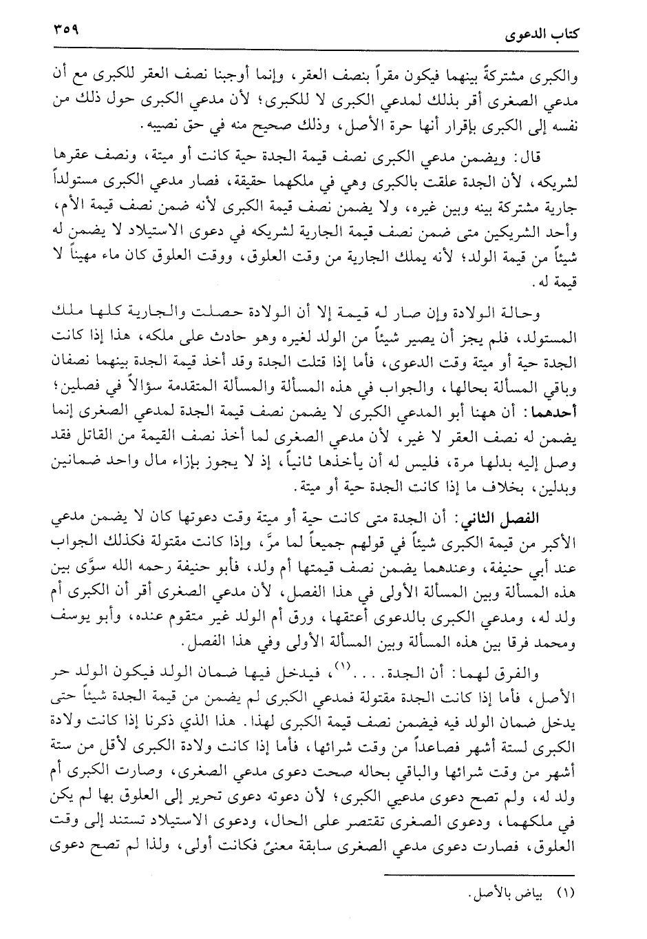 الفصل الثاني: أن الجدة متى كانت حية أو ميتة وقت دعوتها كان لا يضمن مدعي الأكبر من قيمة الكبرى شيئاً في قولهم جميعاً لما مرَّ، وإذا كانت مقتولة فكذلك الجواب عند أبي حنيفة، وعندهما يضمن نصف قيمتها أم ولد، فأبو حنيفة رحمه الله سوَّى بين هذه المسألة وبين المسألة الأولى في هذا الفصل، لأن مدعي الصغرى أقر أن الكبرى أم ولد له، ومدعي الكبرى بالدعوى أعتقها، ورق أم الولد غير متقوم عنده، وأبو يوسف ومحمد فرقا بين هذه المسألة وبين المسألة الأولى وفي هذا الفصل.