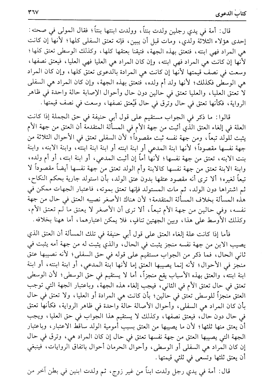 فأما إذا كانت علة إلغاء العتق على قول أبي حنيفة في تلك المسألة أن العتق الذي يصيب الابن من جهة نفسه منجز يثبت في الحال، والذي يثبت له من جهة أمه يثبت في ثاني الحال، فما ذكر من الجواب مستقيم على قوله في حق السفلى؛ لأنه نصيبها عتق منجز في الأحوال؛ لأنه إنما يصيبها العتق إما لأنها ابنة المدعي، أو ابنة ابنته، أو ابنة ابنة ابنته، والعتق بهذه الأسباب يقع منجزاً، أما لا يستقيم في حق الوسطى؛ لأن الوسطى تعتق في حال تعتق الأم في الثاني، فيجب إلغاء هذه الجهة، وباعتبار الجهة التي توجب العتق منجزاً للوسطى تعتق في حالين؛ بأن كانت هي المرادة أو العليا، ولا تعتق في حال بأن كان المراد هي السفلى، وأحوال الأصالة حالة واحدة في ظاهر الرواية، فكأنها تعتق في حال دون حال، فيعتق نصفها، وكذلك لا يستقيم هذا الجواب في حق العليا، ويجب أن يعتق منها ثلثها؛ لأن ما يصيبها من العتق بسبب أمومية الولد ساقط الاعتبار، وباعتبار الجهة التي يصيبها العتق من جهة نفسها تعتق في حال إن كان المراد هي، وترق في حال إن كان المراد هي السفلى أو الوسطى، وأحوال الحرمان أحوال باتفاق الروايات، فينبغي أن يعتق ثلثها وتسعى في ثلثي قيمتها.