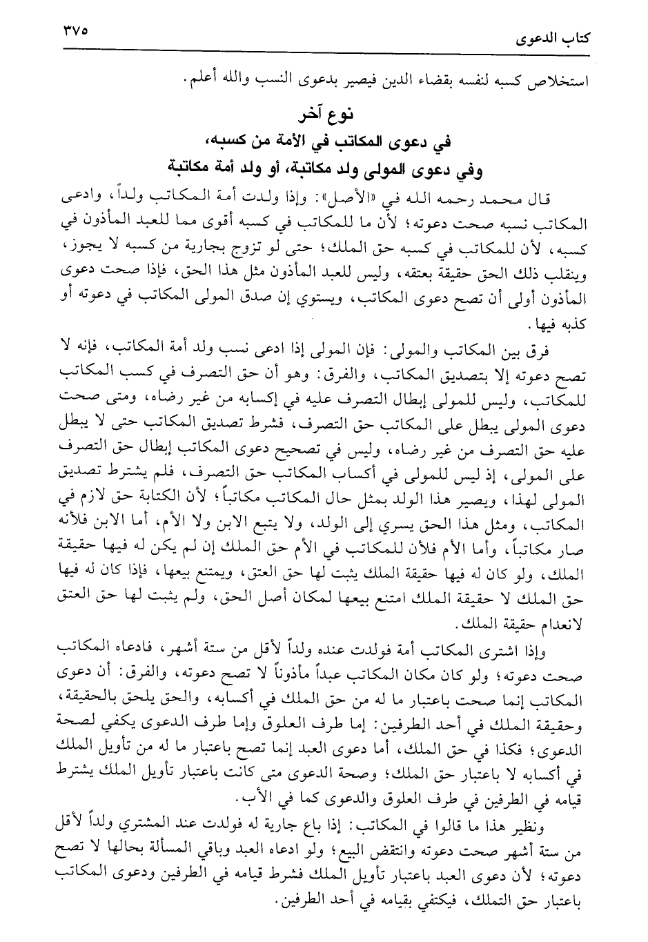 ونظير هذا ما قالوا في المكاتب: إذا باع جارية له فولدت عند المشتري ولداً لأقل من ستة أشهر صحت دعوته وانتقض البيع؛ ولو ادعاه العبد وباقي المسألة بحالها لا تصح دعوته؛ لأن دعوى العبد باعتبار تأويل الملك فشرط قيامه في الطرفين ودعوى المكاتب باعتبار حق التملك، فيكتفي بقيامه في أحد الطرفين.