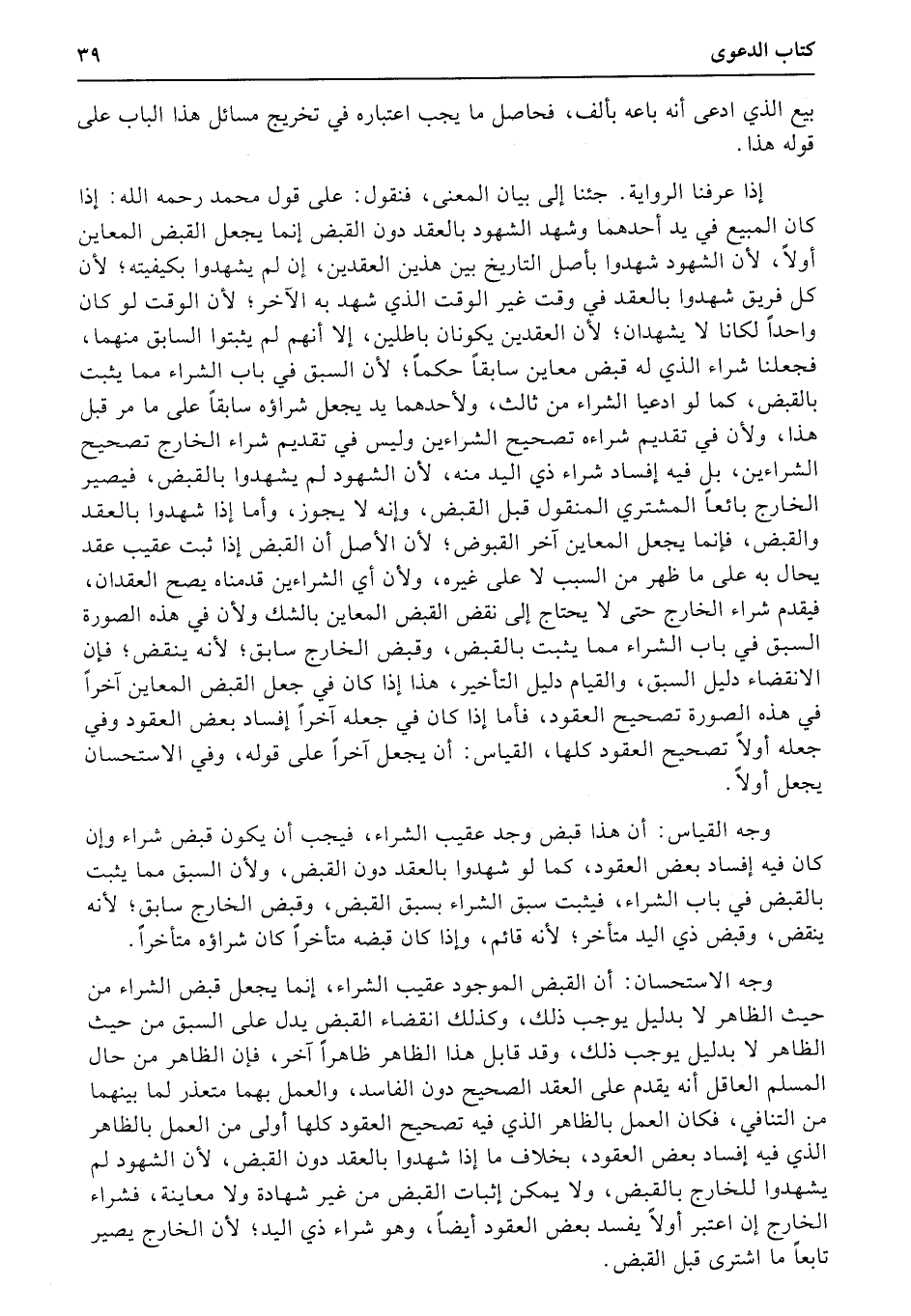 وجه الاستحسان: أن القبض الموجود عقيب الشراء، إنما يجعل قبض الشراء من حيث الظاهر لا بدليل يوجب ذلك، وكذلك انقضاء القبض يدل على السبق من حيث الظاهر لا بدليل يوجب ذلك، وقد قابل هذا الظاهر ظاهراً آخر، فإن الظاهر من حال المسلم العاقل أنه يقدم على العقد الصحيح دون الفاسد، والعمل بهما متعذر لما بينهما من التنافي، فكان العمل بالظاهر الذي فيه تصحيح العقود كلها أولى من العمل بالظاهر الذي فيه إفساد بعض العقود، بخلاف ما إذا شهدوا بالعقد دون القبض، لأن الشهود لم يشهدوا للخارج بالقبض، ولا يمكن إثبات القبض من غير شهادة ولا معاينة، فشراء الخارج إن اعتبر أولاً يفسد بعض العقود أيضاً، وهو شراء ذي اليد؛ لأن الخارج يصير تابعاً ما اشترى قبل القبض.Y