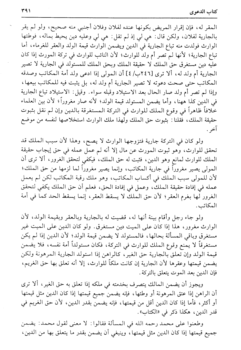 ولو كان في التركة جارية فتزوجها الوارث لا يصح، وهذا لأن سبب الملك قد تحقق للوارث، وهو ثبوت المورث عن مال إلا أنه لم عمل عمله في حق إيجاب حقيقة الملك للوارث لمانع وهو الدين، فثبت له حق الملك، فيكفي لتحقق الغرور، ألا ترى أن المولى يصير مغروراً في جارية المكاتب، وإنما يصير مغروراً لما لزمها من حق الملك؛ لأن للمولى سبب الملك في أكساب المكاتب، وهو ملك رقبة المكاتب لكن لم يعمل عمله في إفادة حقيقة الملك، وعمل في إفادة الحق، فعلم أن حق الملك يكفي لتحقق الغرور لها بغرم العقر؛ لأن حق الملك لا يسقط العقر، إنما يسقط الحد كما في أمة المكاتب.