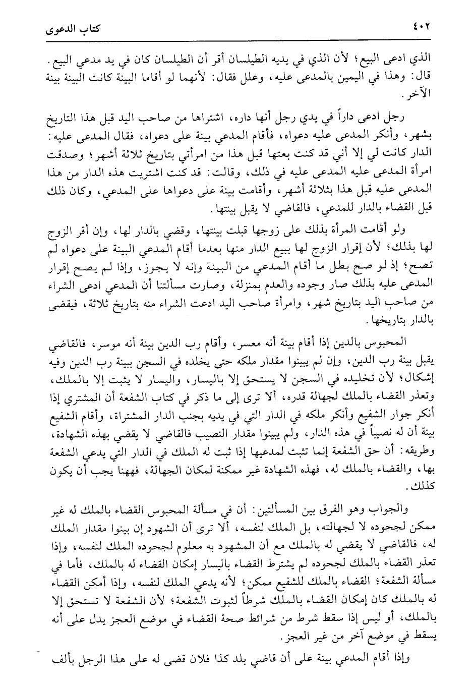 والجواب وهو الفرق بين المسألتين: أن في مسألة المحبوس القضاء بالملك له غير ممكن لجحوده لا لجهالته، بل الملك لنفسه، ألا ترى أن الشهود إن بينوا مقدار الملك له، فالقاضي لا يقضي له بالملك مع أن المشهود به معلوم لجحوده الملك لنفسه، وإذا تعذر القضاء بالملك لجحوده لم يشترط القضاء باليسار إمكان القضاء له بالملك، فأما في مسألة الشفعة؛ القضاء بالملك للشفيع ممكن؛ لأنه يدعي الملك لنفسه، وإذا أمكن القضاء له بالملك كان إمكان القضاء بالملك شرطاً لثبوت الشفعة؛ لأن الشفعة لا تستحق إلا بالملك، أو ليس إذا سقط شرط من شرائط صحة القضاء في موضع العجز يدل على أنه يسقط في موضع آخر من غير العجز.