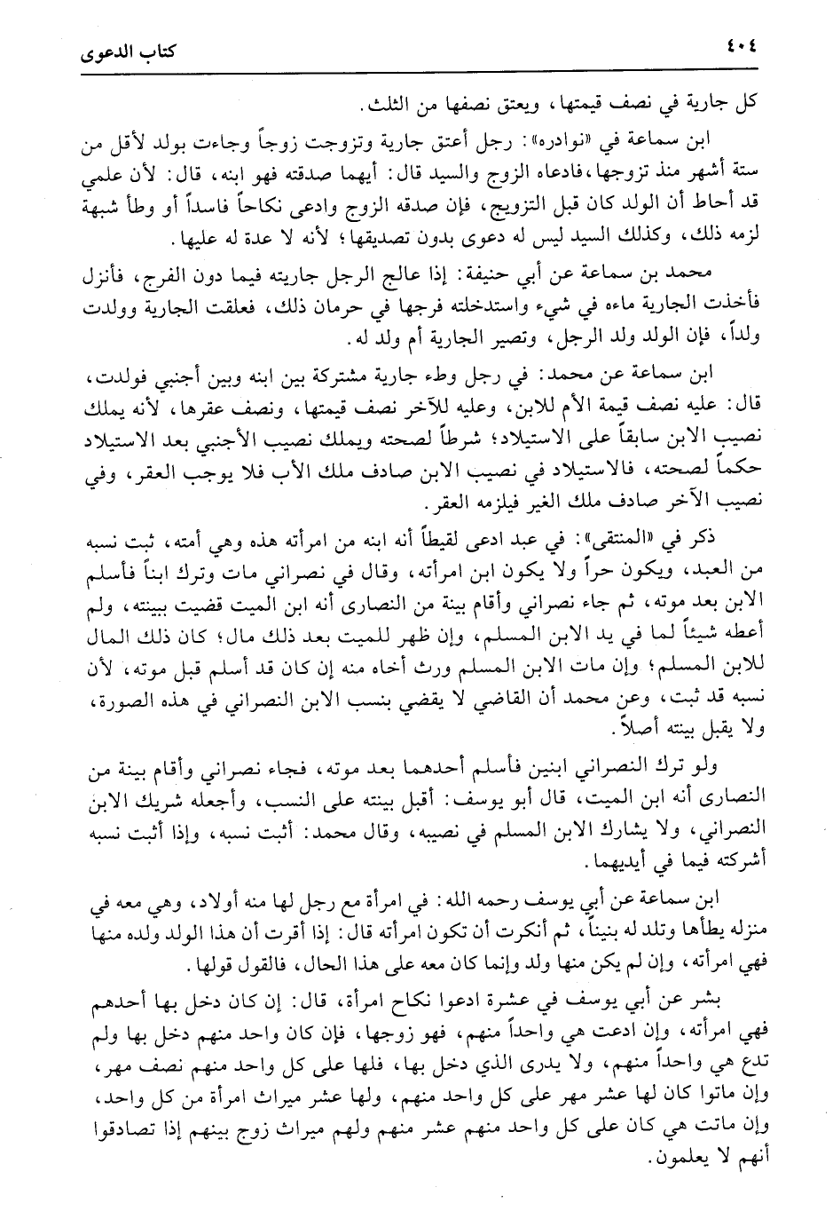 ذكر في «المنتقى» : في عبد ادعى لقيطاً أنه ابنه من امرأته هذه وهي أمته، ثبت نسبه من العبد، ويكون حراً ولا يكون ابن امرأته، وقال في نصراني مات وترك ابناً فأسلم الابن بعد موته، ثم جاء نصراني وأقام بينة من النصارى أنه ابن الميت قضيت ببينته، ولم أعطه شيئاً لما في يد الابن المسلم، وإن ظهر للميت بعد ذلك مال؛ كان ذلك المال للابن المسلم؛ وإن مات الابن المسلم ورث أخاه منه إن كان قد أسلم قبل موته، لأن نسبه قد ثبت، وعن محمد أن القاضي لا يقضي بنسب الابن النصراني في هذه الصورة، ولا يقبل بينته أصلاً.