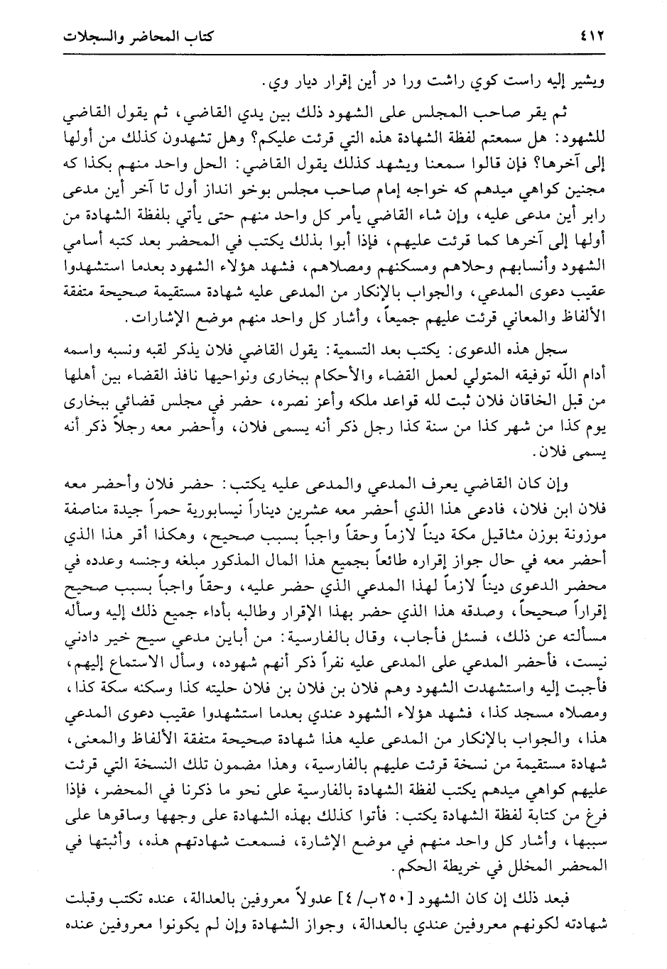 سجل هذه الدعوى: يكتب بعد التسمية: يقول القاضي فلان يذكر لقبه ونسبه واسمه أدام الله توفيقه المتولي لعمل القضاء والأحكام ببخارى ونواحيها نافذ القضاء بين أهلها من قبل الخاقان فلان ثبت لله قواعد ملكه وأعز نصره، حضر في مجلس قضائي ببخارى يوم كذا من شهر كذا من سنة (كذا) رجل ذكر أنه يسمى فلان، وأحضر معه رجلاً ذكر أنه يسمى فلان.