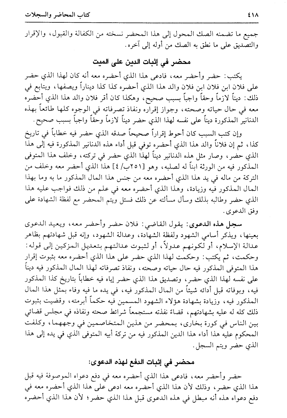 محضر في إثبات الدين على الميت يكتب: حضر وأحضر معه، فادعى هذا الذي أحضره معه أنه كان لهذا الذي حضر على فلان بن فلان بن فلان والد هذا (الذي) أحضره كذا كذا ديناراً ويصفها، ويتابع في ذلك: ديناً لازماً وحقاً واجباً بسبب صحيح، وهكذا كان أقر فلان والد هذا الذي أحضره معه في حال حياته وصحته، وجواز إقراره ونفاذ تصرفاته في الوجوه كلها طائعاً بهذه الدنانير المذكورة ديناً على نفسه لهذا الذي حضر ديناً لازماً وحقاً واجباً بسبب صحيح.