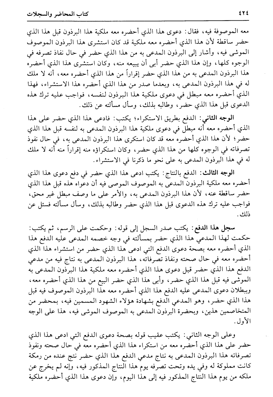 سجل هذا الدفع: يكتب صدر السجل إلى قوله: وحكمت على الرسم، ثم يكتب: حكمت لهذا المدعي هذا الذي حضر بمسألته في وجه خصمه المدعى عليه الدفع هذا الذي أحضره معه بصحة دعوى الدفع التي ادعى هذا الذي حضر من استشراء هذا الذي أحضره معه في حال صحته ونفاذ تصرفاته، هذا البرذون المدعى به نتاج فيه من مدعي الدفع هذا الذي حضر قبل دعوى هذا الذي أحضره معه ملكية هذا البرذون المدعى به الموشى فيه قبل هذا الذي حضر، وأبى هذا الذي حضر البيع من هذا الذي أحضره معه، وببطلان دعوى المدعى عليه الدفع هذا الذي أحضره معه هذا البرذون الموصوف فيه قبل هذا الذي حضر، وهو المدعي الدفع بشهادة هؤلاء الشهود المسمين فيه، بمحضر من المتخاصمين هذين، وبحضرة البرذون المدعى به الموصوف الموشى فيه، هذا على الوجه الأول.