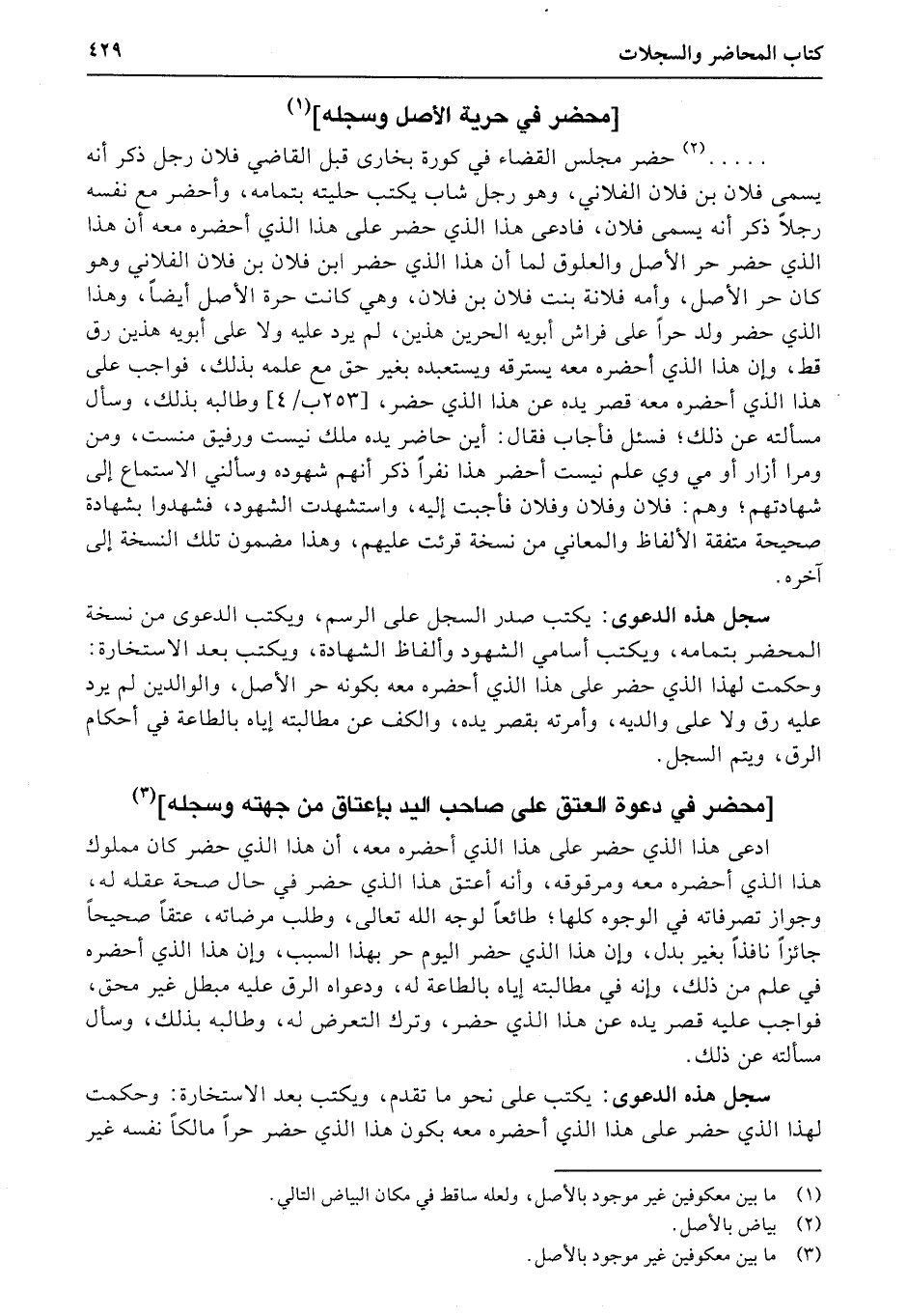 ..... حضر مجلس القضاء في كورة بخارى قبل القاضي فلان رجل ذكر أنه يسمى فلان بن فلان الفلاني، وهو رجل شاب يكتب حليته بتمامه، وأحضر مع نفسه رجلاً ذكر أنه يسمى فلان، فادعى هذا الذي حضر على هذا الذي أحضره معه أن هذا الذي حضر حر الأصل والعلوق لما أن هذا الذي حضر ابن فلان بن فلان الفلاني وهو كان حر الأصل، وأمه فلانة بنت فلان بن فلان، وهي كانت حرة الأصل أيضاً، وهذا الذي حضر ولد حراً على فراش أبويه الحرين هذين، لم يرد عليه ولا على أبويه هذين رق قط، وإن هذا الذي أحضره معه يسترقه ويستعبده بغير حق مع علمه بذلك، فواجب على هذا الذي أحضره معه قصر يده عن هذا الذي حضر، (253ب4) وطالبه بذلك، وسأل مسألته عن ذلك؛ فسئل فأجاب فقال: أين حاضر يده ملك نيست ورفيق منست، ومن ومرا أزار أو مي وي علم نيست أحضر هذا نفراً ذكر أنهم شهوده وسألني الاستماع إلى شهادتهم؛ وهم: فلان وفلان وفلان فأجبت إليه، واستشهدت الشهود، فشهدوا بشهادة صحيحة متفقة الألفاظ والمعاني من نسخة قرئت عليهم، وهذا مضمون تلك النسخة إلى آخره.