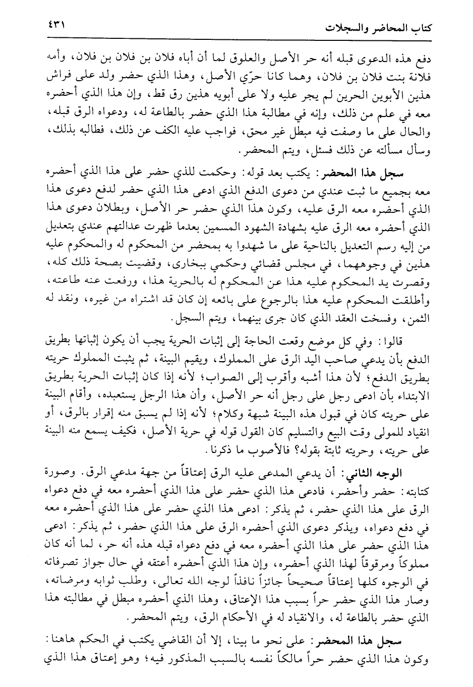 سجل هذا المحضر: يكتب بعد قوله: وحكمت للذي حضر على هذا الذي أحضره معه بجميع ما ثبت عندي من دعوى الدفع الذي ادعى هذا الذي حضر لدفع دعوى هذا الذي أحضره معه الرق عليه، وكون هذا الذي حضر حر الأصل، وبطلان دعوى هذا الذي أحضره معه الرق عليه بشهادة الشهود المسمين بعدما ظهرت عدالتهم عندي بتعديل من إليه رسم التعديل بالناحية على ما شهدوا به بمحضر من المحكوم له والمحكوم عليه هذين في وجوههما، في مجلس قضائي وحكمي ببخارى، وقضيت بصحة ذلك كله، وقصرت يد المحكوم عليه هذا عن المحكوم له بالحرية هذا، ورفعت عنه طاعته، وأطلقت المحكوم عليه هذا بالرجوع على بائعه إن كان قد اشتراه من غيره، ونقد له الثمن، وفسخت العقد الذي كان جرى بينهما، ويتم السجل.