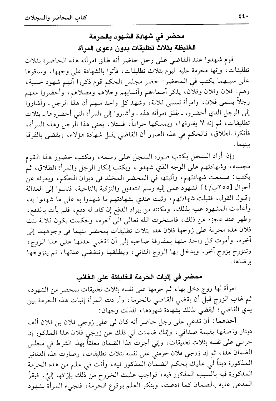 سجل هذه الدعوى على نحو ما بينا إلى قوله: أحضرت المدعية نفراً ذكر (ت) أنهم شهودها على موافقة الدعوى، وسألتني شهادتهم، فأجبتها إلى ذلك، فشهدوا بعد الإشهاد عقيب الدعوى، والإنكار من المدعى عليه وقوع هذه الحرمة الواحد بعد الآخر من نسخة قرئت عليهم، وهذا مضمون تلك النسخة: كواهي سيدهم كه اين زن حاضر آسده، وأشار إلى المدعية هذه زن فلان بن فلان بود وبرا برخو يشتن حام كرد به طلاق، وأمرد زاين زن حاضر أده محرمة است برين فلان بس طلاق، وأشار كل واحد منهم في جميع مواضع الإشارة، فسمعت شهادتهم إلى أن يصل إلى قوله: وحكمت بكون هذه المرأة التي حضرت محرمة على زوجها فلان بالسبب المذكور فيه، وقضيت لهذه التي حضرت على هذا الذي أحضرته معها بوجوب هذا المال المذكور مبلغه وجنسه فيه، وذلك كذا بسبب الضمان المذكور، وعند وجود شرطه، وهو تحريم فلان زوج هذه التي حضرت إياها على الوجه المذكور فيه في وجه المتخاصمين هذين، ويتم السجل.