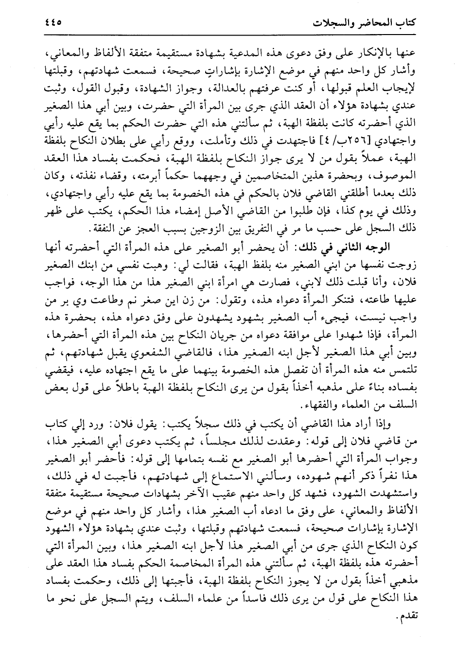 وإذا أراد هذا القاضي أن يكتب في ذلك سجلاً يكتب: يقول فلان: ورد إلي كتاب من قاضي فلان إلى قوله: وعقدت لذلك مجلساً، ثم يكتب دعوى أب الصغير هذا، وجواب المرأة التي أحضرها أب الصغير مع نفسه بتمامها إلى قوله: فأحضر أب الصغير هذا نفراً ذكر أنهم شهوده، وسألني الاستماع إلى شهادتهم، فأجبت له في ذلك، واستشهدت الشهود، فشهد كل واحد منهم عقيب الآخر بشهادات صحيحة مستقيمة متفقة الألفاظ والمعاني، على وفق ما ادعاه أب الصغير هذا، وأشار كل واحد منهم في موضع الإشارة بإشارات صحيحة، فسمعت شهادتهم وقبلتها، وثبت عندي بشهادة هؤلاء الشهود كون النكاح الذي جرى من أب الصغير هذا لأجل ابنه الصغير هذا، وبين المرأة التي أحضرته هذه بلفظة الهبة، ثم سألتني هذه المرأة المخاصمة الحكم بفساد هذا العقد على مذهبي أخذاً بقول من لا يجوز النكاح بلفظة الهبة، فأجبتها إلى ذلك، وحكمت بفساد هذا النكاح على قول من يرى ذلك فاسداً من علماء السلف، ويتم السجل على نحو ما تقدم.
