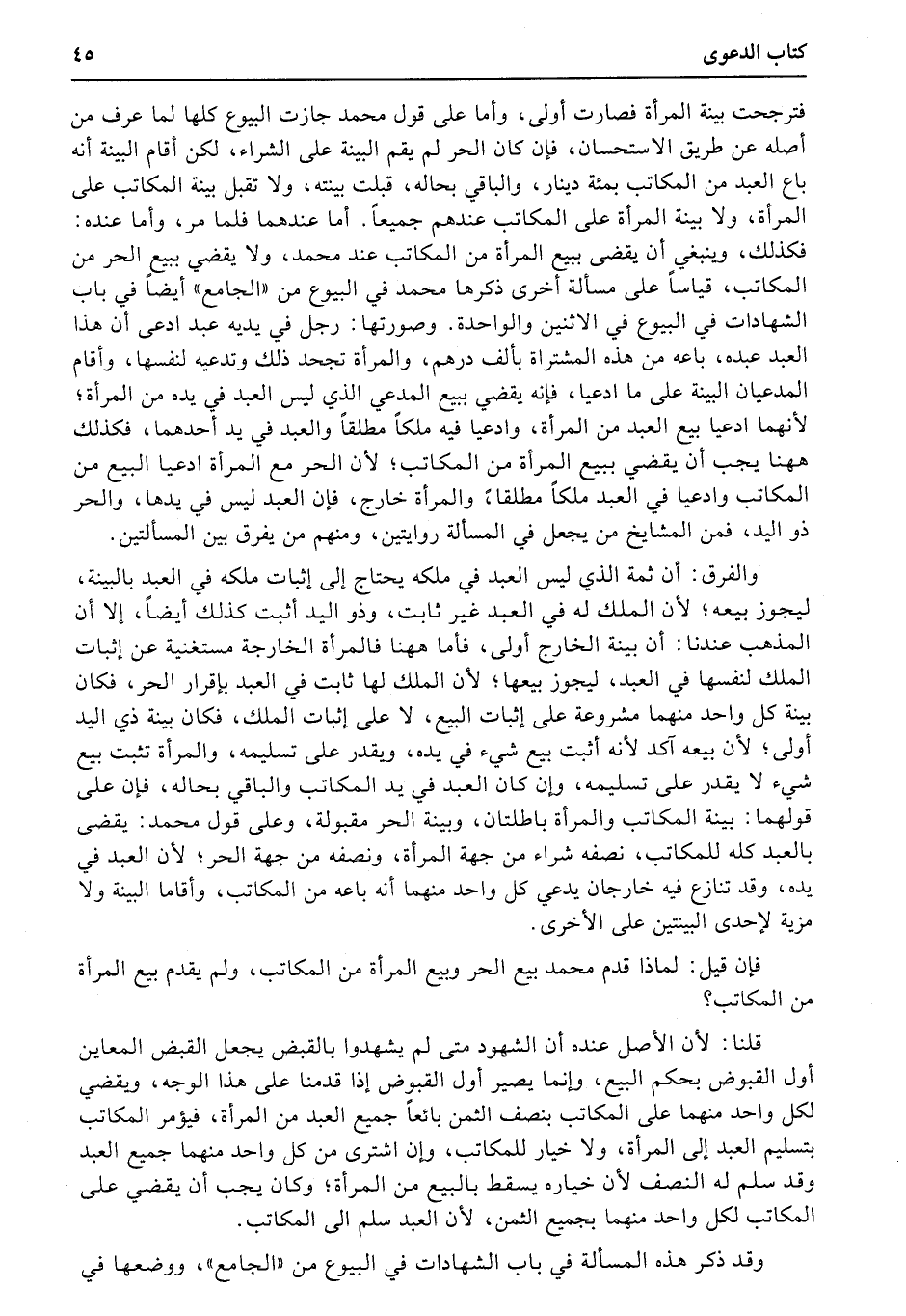فترجحت بينة المرأة فصارت أولى، وأما على قول محمد جازت البيوع كلها لما عرف من أصله عن طريق الاستحسان، فإن كان الحر لم يقم البينة على الشراء، لكن أقام البينة أنه باع العبد من المكاتب بمئة دينار، والباقي بحاله، قبلت بينته، ولا تقبل بينة المكاتب على المرأة، ولا بينة المرأة على المكاتب عندهم جميعاً. أما عندهما فلما مر، وأما عنده: فكذلك، وينبغي أن يقضى ببيع المرأة من المكاتب عند محمد، ولا يقضي ببيع الحر من المكاتب، قياساً على مسألة أخرى ذكرها محمد في البيوع من «الجامع» أيضاً في باب الشهادات في البيوع في الاثنين والواحدة.