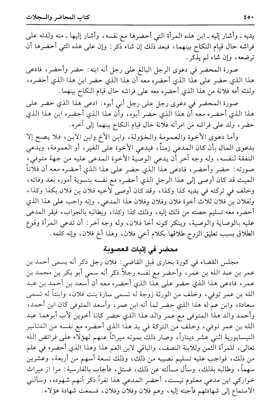 مجلس القضاء في كورة بخارى قبل القاضي: فلان رجل ذكر أنه يسمى أحمد بن عمر بن عبد الله بن عمر، وأحضر مع نفسه رجلاً ذكر أنه سمي أبو بكر بن محمد بن عمر، فادعى هذا الذي حضر على هذا الذي أحضره معه أن أسعد بن أحمد بن عبد الله بن عمر توفي، وخلف من الورثة زوجة له تسمى سارة بنت فلان، وابنتاً له تسمى سعادة، وابن عم له هذا الذي حضر لما أنه ابن عمر، وأسعد المتوفى كان ابن أحمد، وأحمد والد هذا المتوفى مع عمر والد هذا الذي حضر كانا أخوين لأب أبوهما عبد الله بن عمر توفي، وخلف من التركة في يد هذا الذي أحضره مع نفسه من الدنانير النيسابورية اثني عشر ديناراً، وصار ذلك بموته ميراثاً عنهم لهؤلاء على فرائض الله تعالى، للمرأة الثمن وللابنة النصف، والباقي لابن العم هذا وهذا الذي (أحضره) في علم من ذلك، فواجب عليه تسليم نصيبه من ذلك، وذلك تسعة أسهم من أربعة، وعشرين سهماً، وطالبه بذلك، وسأل مسألته عن ذلك، فسئل، فأجاب بالفارسية: مرا از ميراث خواركي اين مدعي معلوم نيست، أحضر المدعي هذا نفراً ذكر أنهم شهوده، وسألني الاستماع إلى شهادتهم فأجبته إليه، وهم فلان وفلان وفلان، فسمعت شهادة هؤلاء.