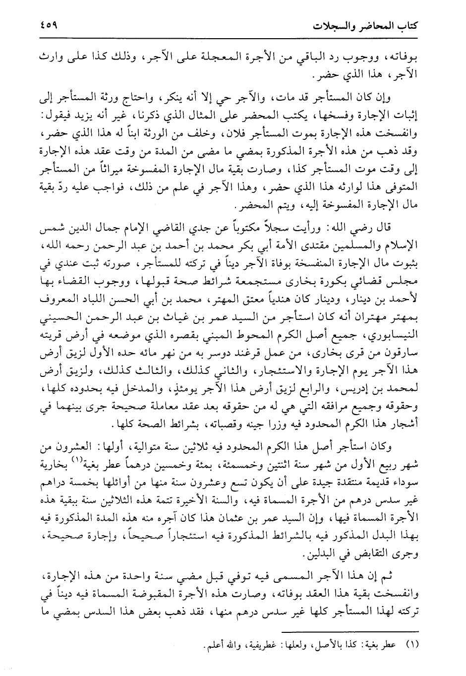 قال رضي الله: ورأيت سجلاً مكتوباً عن جدي القاضي الإمام جمال الدين شمس الإسلام والمسلمين مقتدى الأمة أبي بكر محمد بن أحمد بن عبد الرحمن رحمه الله، بثبوت مال الإجارة المنفسخة بوفاة الآجر ديناً في تركته للمستأجر، صورته ثبت عندي في مجلس قضائي بكورة بخارى مستجمعة شرائط صحة قبولها، ووجوب القضاء بها لأحمد بن دينار، ودينار كان هندياً معتق المهتر، محمد بن أبي الحسن اللباد المعروف بمهتر مهتران أنه كان استأجر من السيد عمر بن غياث بن عبد الرحمن الحسيني النيسابوري، جميع أصل الكرم المحوط المبني بقصره الذي موضعه في أرض قريته سارقون من قرى بخارى، من عمل قرغند دوسر به من نهر مائه حده الأول لزيق أرض هذا الآجر يوم الإجارة والاستئجار، والثاني كذلك، والثالث كذلك، ولزيق أرض لمحمد بن إدريس، والرابع لزيق أرض هذا الآجر يومئذٍ، والمدخل فيه بحدوده كلها، وحقوقه وجميع مرافقه التي هي له من حقوقه بعد عقد معاملة صحيحة جرى بينهما في أشجار هذا الكرم المحدود فيه وزرا جينه وقصباته، بشرائط الصحة كلها.x