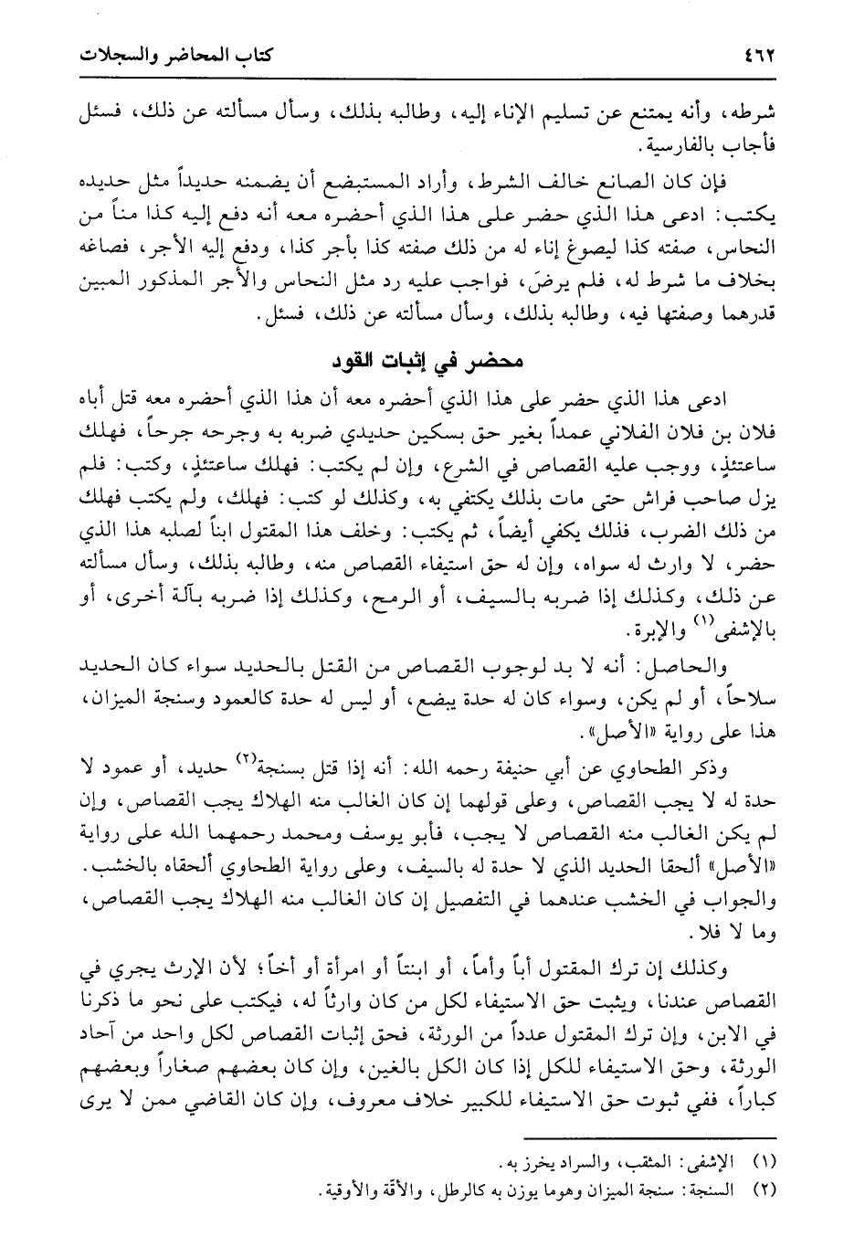 وذكر الطحاوي عن أبي حنيفة رحمه الله: أنه إذا قتل بسنجة حديد، أو عمود لا حدة له لا يجب القصاص، وعلى قولهما إن كان الغالب منه الهلاك يجب القصاص، وإن لم يكن الغالب منه القصاص لا يجب، فأبو يوسف ومحمد رحمهما الله على رواية «الأصل» ألحقا الحديد الذي لا حدة له بالسيف، وعلى رواية الطحاوي ألحقاه بالخشب. والجواب في الخشب عندهما في التفصيل إن كان الغالب منه الهلاك يجب القصاص، وما لا فلا.