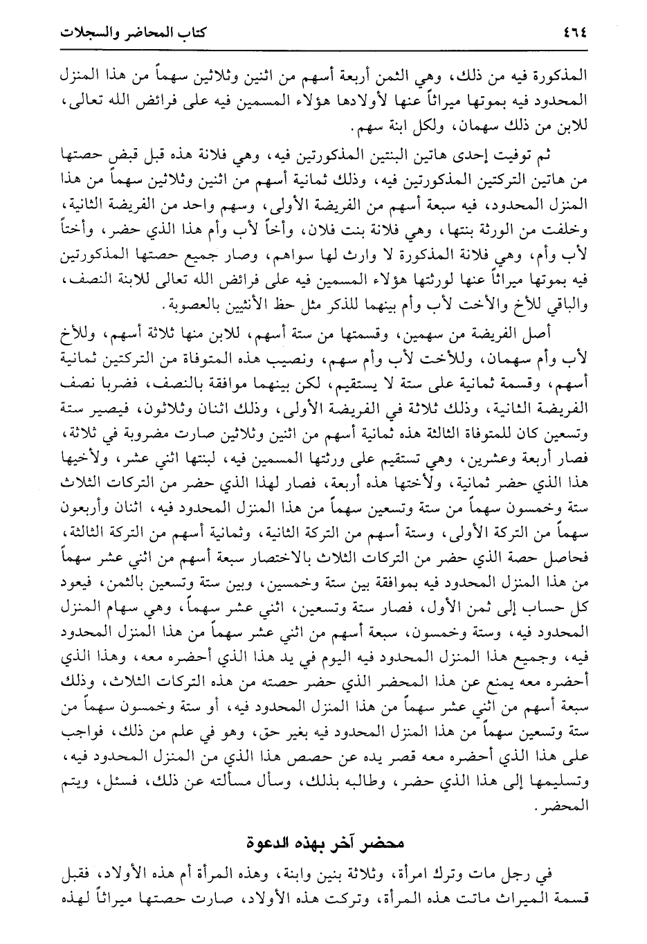 أصل الفريضة من سهمين، وقسمتها من ستة أسهم، للابن منها ثلاثة أسهم، وللأخ لأب وأم سهمان، وللأخت لأب وأم سهم، ونصيب هذه المتوفاة من التركتين ثمانية أسهم، وقسمة ثمانية على ستة لا يستقيم، لكن بينهما موافقة بالنصف، فضربا نصف الفرضة الثانية، وذلك ثلاثة في الفريضة الأولى، وذلك اثنان وثلاثون، فيصير ستة وتسعين كان للمتوفاة الثالثة هذه ثمانية أسهم من اثنين وثلاثين صارت مضروبة في ثلاثة، فصار أربعة وعشرين، وهي تستقيم على ورثتها المسمين فيه، لبنتها اثني عشر، ولأخيها هذا الذي حضر ثمانية، ولأختها هذه أربعة، فصار لهذا الذي حضر من التركات الثلاث ستة وخمسون سهماً من ستة وتسعين سهماً من هذا المنزل المحدود فيه، اثنان وأربعون سهماً من التركة الأولى، وستة أسهم من التركة الثانية، وثمانية أسهم من التركة الثالثة، فحاصل حصة الذي حضر من التركات الثلاث بالاختصار سبعة أسهم من اثني عشر سهماً من هذا المنزل المحدود فيه بموافقة بين ستة وخمسين، وبين ستة وتسعين بالثمن، فيعود كل حساب إلى ثمن الأول، فصار ستة وتسعين، اثني عشر سهماً، وهي سهام المنزل المحدود فيه، وستة وخمسون، سبعة أسهم من اثني عشر سهماً من هذا المنزل المحدود فيه، وجميع هذا المنزل المحدود فيه اليوم في يد هذا الذي أحضره معه، وهذا الذي أحضره معه يمنع عن هذا المحضر الذي حضر حصته من هذه التركات الثلاث، وذلك سبعة أسهم من اثني عشر سهماً من هذا المنزل المحدود فيه، أو ستة وخمسون سهماً من ستة وتسعين سهماً من هذا المنزل المحدود فيه بغير حق، وهو في علم من ذلك، فواجب على هذا الذي أحضره معه قصر يده عن حصص هذا الذي من المنزل المحدود فيه، وتسليمها إلى هذا الذي حضر، وطالبه بذلك، وسأل مسألته عن ذلك، فسئل، ويتم المحضر.
