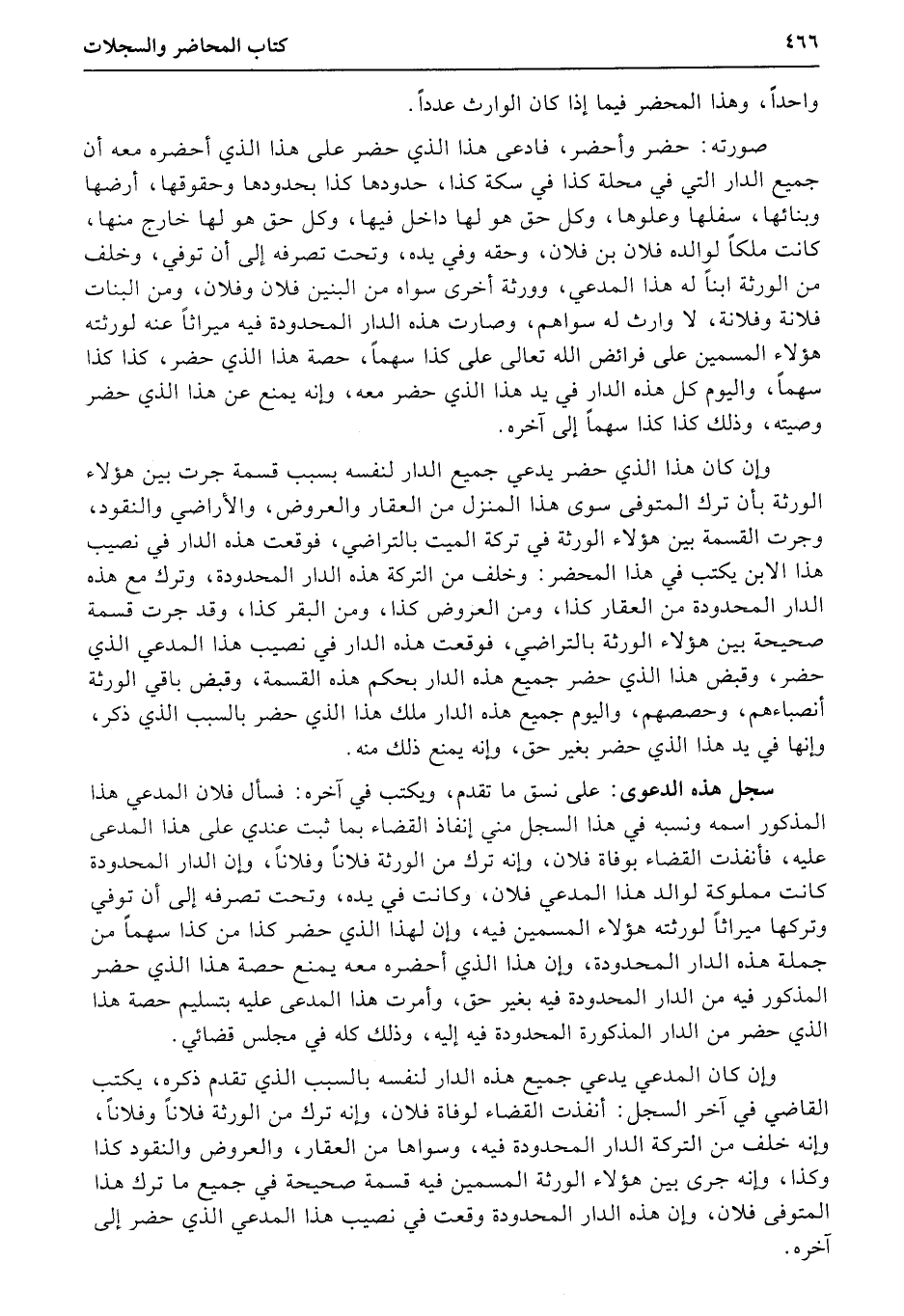 سجل هذه الدعوى على نسق ما تقدم، ويكتب في آخره: فسأل فلان المدعي هذا المذكور اسمه ونسبه في هذا السجل مني إنفاذ القضاء بما ثبت عندي على هذا المدعى عليه، فأنفذت القضاء بوفاة فلان، وإنه ترك من الورثة فلاناً وفلاناً، وإن الدار المحدودة كانت مملوكة لوالد هذا المدعي فلان، وكانت في يده، وتحت تصرفه إلى أن توفي وتركها ميراثاً لورثته هؤلاء المسمين فيه، وإن لهذا الذي حضر كذا من كذا سهماً من جملة هذه الدار المحدودة، وإن هذا الذي أحضره معه يمنع حصة هذا الذي حضر المذكور فيه من الدار المحدودة فيه بغير حق، وأمرت هذا المدعى عليه بتسليم حصة هذا الذي حضر من الدار المذكورة المحدودة فيه إليه، وذلك كله في مجلس قضائي.