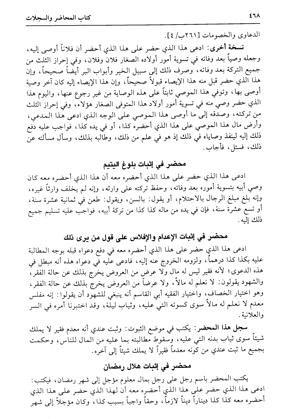 سجل هذا المحضر: يكتب في موضع الثبوت: وثبت عندي أنه معدم فقير لا يملك شيئاً سوى ثياب بدنه التي عليه، وسقوط مطالبته بما عليه من المال للناس، وحكمت بجميع ما ثبت عندي من كونه معدماً فقيراً لا يملك شيئاً إلى آخره.