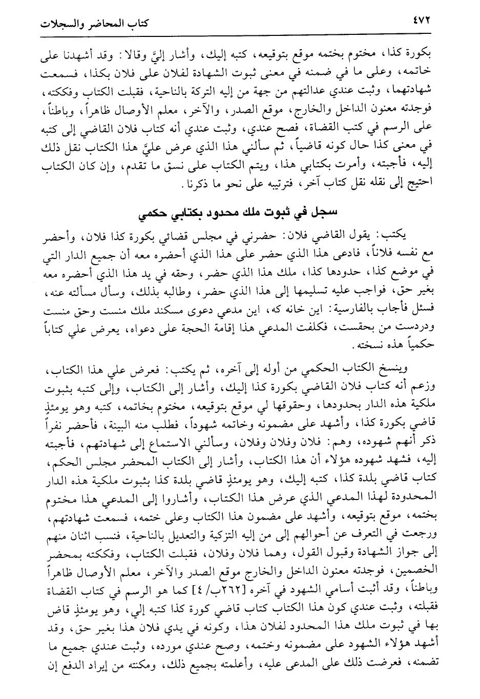 سجل في ثبوت ملك محدود بكتابي حكمي يكتب: يقول القاضي فلان: حضرني في مجلس قضائي بكورة كذا فلان، وأحضر مع نفسه فلاناً، فادعى هذا الذي حضر على هذا الذي أحضره معه أن جميع الدار التي في موضع كذا، حدودها كذا، ملك هذا الذي حضر، وحقه في يد هذا الذي أحضره معه بغير حق، فواجب عليه تسليمها إلى هذا الذي حضر، وطالبه بذلك، وسأل مسألته عنه، فسئل فأجاب بالفارسية: اين خانه كه، اين مدعي دعوى مسكند ملك منست وحق منست ودردست من بحقست، فكلفت المدعي هذا إقامة الحجة على دعواه، يعرض علي كتاباً حكمياً هذه نسخته.