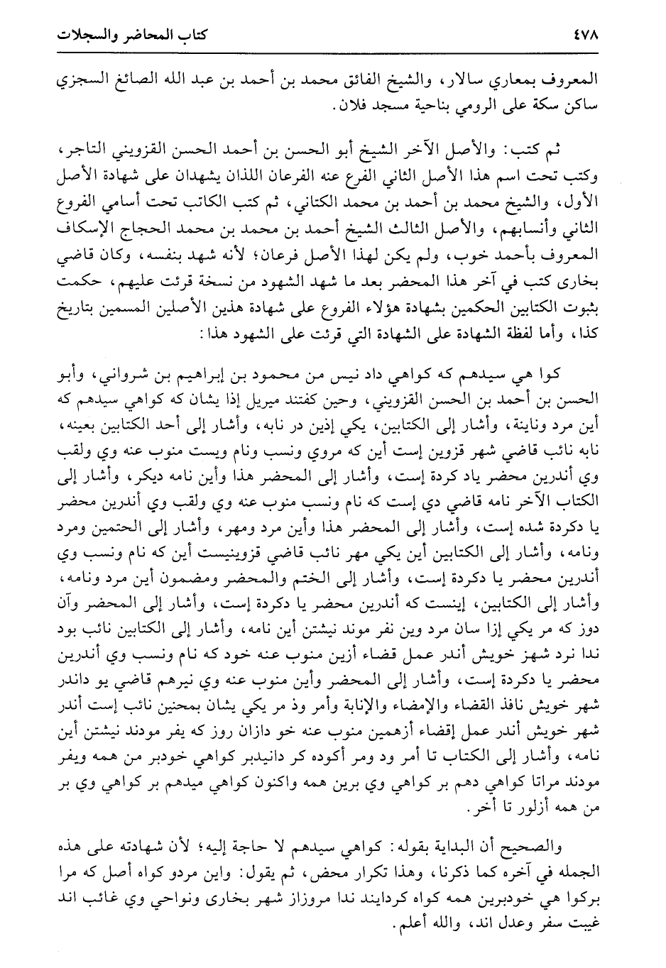 ثم كتب: والأصل الآخر الشيخ أبو الحسن بن أحمد الحسن القزويني التاجر، وكتب تحت اسم هذا الأصل الثاني الفرع عنه الفرعان اللذان يشهدان على شهادة الأصل الأول، والشيخ محمد بن أحمد بن محمد الكتاني، ثم كتب الكاتب تحت أسامي الفروع الثاني وأنسابهم، والأصل الثالث الشيخ أحمد بن محمد بن محمد الحجاج الإسكاف المعروف بأحمد خوب، ولم يكن لهذا الأصل فرعان؛ لأنه شهد بنفسه، وكان قاضي بخارى كتب في آخر هذا المحضر بعد ما شهد الشهود من نسخة قرئت عليهم، حكمت بثبوت الكتابين الحكمين بشهادة هؤلاء الفروع على شهادة هذين الأصلين المسمين بتاريخ كذا، وأما لفظة الشهادة على الشهادة التي قرئت على الشهود هذا: