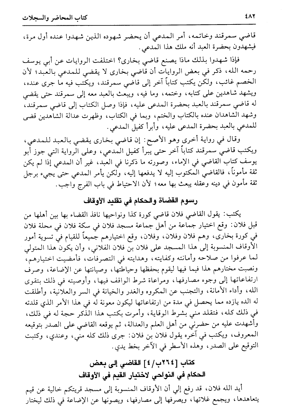 رسوم القضاة والحكام في تقليد الأوقاف، يكتب: يقول القاضي فلان قاضي كورة كذا ونواحيها نافذ القضاء بها بين أهلها من قبل فلان: وقع اختيار جماعة من أهل جماعة مسجد فلان في سكة فلان في محلة فلان في كورة بخارى، وهم فلان وفلان، وفلان، وقع اختيارهم جميعاً للقيام في تسوية أمور الأوقاف المنسوبة إلى هذا المسجد على فلان بن فلان الفلاني، وأن يكون هذا المتولي لما عرفوا من صلاحه وأمانته وكفايته، وهدايته في التصرفات، فأمضيت اختيارهم، ونصبت مختارهم هذا فيما فيها ليقوم بحفظها وحياطتها، وصيانتها عن الإضاعة، وصرف ارتفاعاتها إلى وجوه مصارفها، ومراعاة شرط الواقف فيها، وأوصيته في ذلك بتقوى الله، وأداء الأمانة، والتجنب عن المكروه والغدر والخيانة في السر والعلانية، وأطلقت له الده يازده مما يحصل في مدة من ارتفاعاتها ليكون معونة له في هذا الأمر الذي قلدته في ذلك كله، فتقلد مني بشرط الوقاية، وأمرت بكتب هذا الذكر حجة له في ذلك، وأشهدت عليه من حضرني من أهل العلم والعدالة، ثم يوقعه القاضي على الصدر بتوقيعه المعروف، ويكتب في آخره يقول فلان بن فلان: جرى ذلك كله مني، وعندي، وكتبت التوقيع على الصدر، وهذه الأسطر في الآخر بخط يدي.