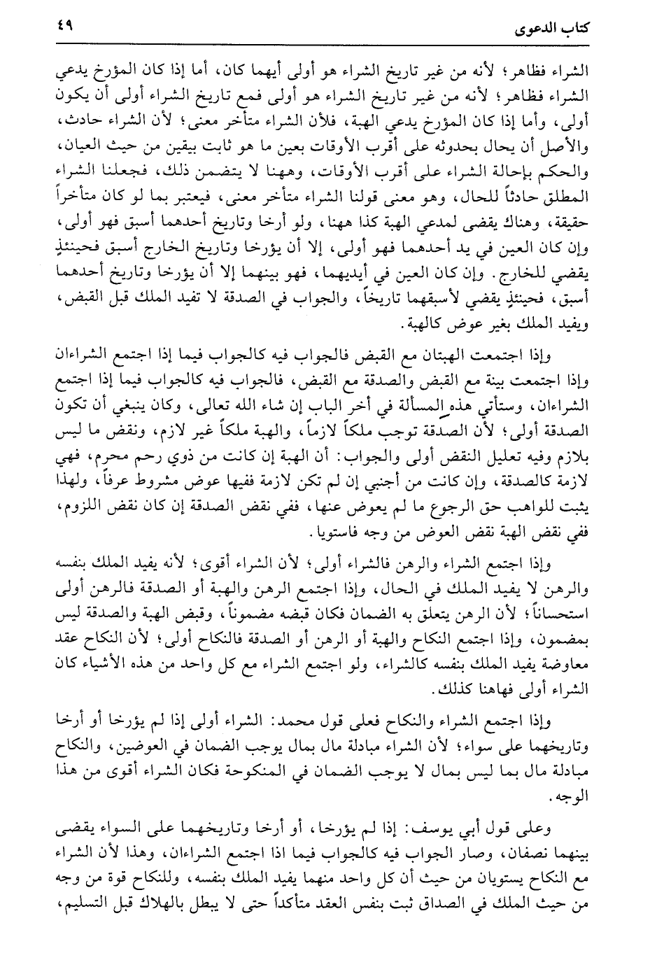وإذا اجتمعت الهبتان مع القبض فالجواب فيه كالجواب فيما إذا اجتمع الشاءان وإذا اجتمعت بينة مع القبض والصدقة مع القبض، فالجواب فيه كالجواب فيما إذا اجتمع الشراءان، وستأتي هذه المسألة في أخر الباب إن شاء الله تعالى، وكان ينبغي أن تكون الصدقة أولى؛ لأن الصدقة توجب ملكاً لازماً، والهبة ملكاً غير لازم، ونقض ما ليس بلازم وفيه تعليل النقض أولى والجواب: أن الهبة إن كانت من ذوي رحم محرم، فهي لازمة كالصدقة، وإن كانت من أجنبي إن لم تكن لازمة ففيها عوض مشروط عرفاً، ولهذا يثبت للواهب حق الرجوع ما لم يعوض عنها، ففي نقض الصدقة إن كان نقض اللزوم، ففي نقض الهبة نقض العوض من وجه فاستويا.