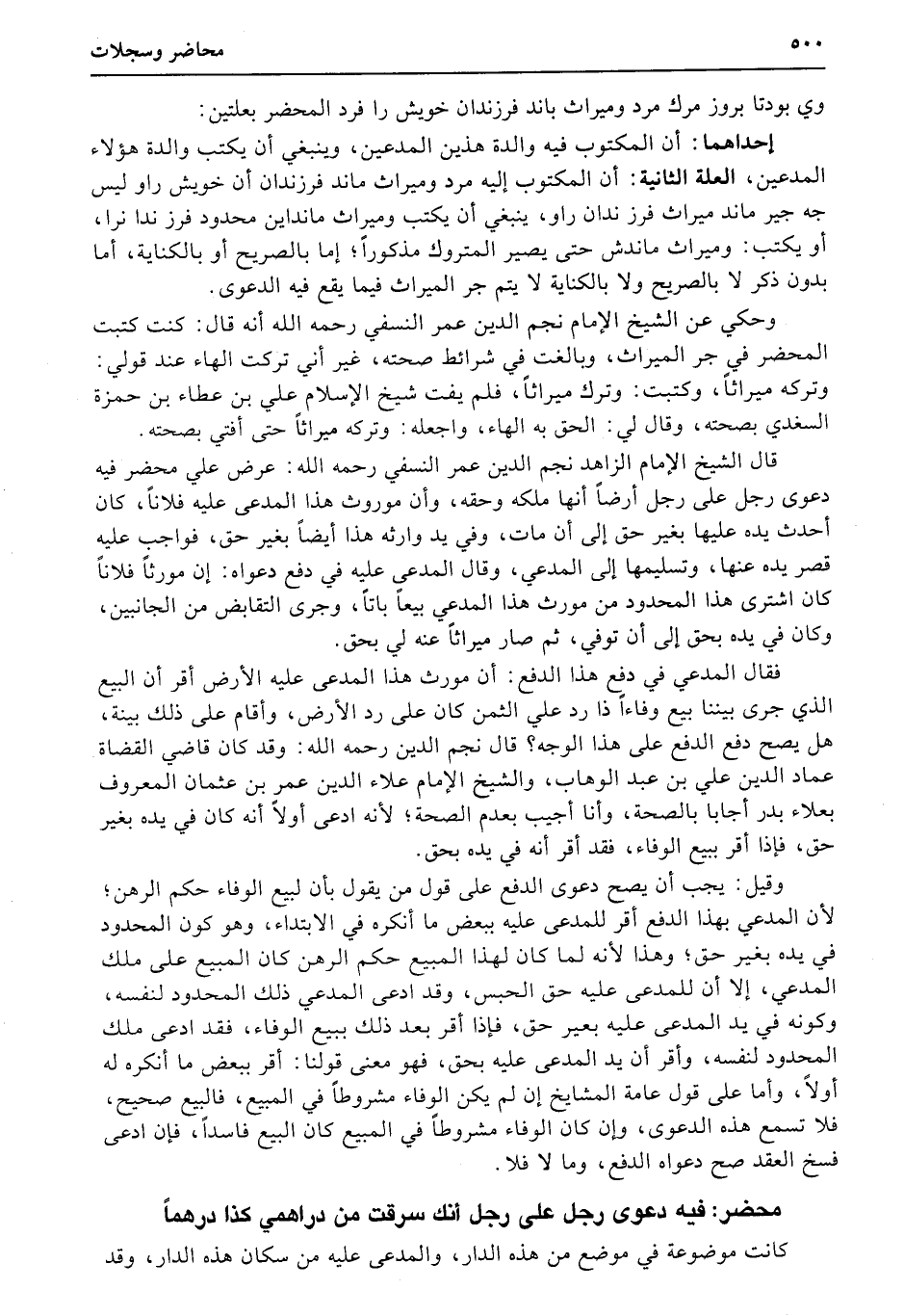 وحكي عن الشيخ الإمام نجم الدين عمر النسفي رحمه الله أنه قال: كنت كتبت المحضر في جر الميراث، وبالغت في شرائط صحته، غير أني تركت الهاء عند قولي: وتركه ميراثاً، وكتبت: وترك ميراثاً، فلم يفت شيخ الإسلام علي بن عطاء بن حمزة السعدي بصحته، وقال لي: الحق به الهاء، واجعله: وتركه ميراثاً حتى أفتي بصحته.