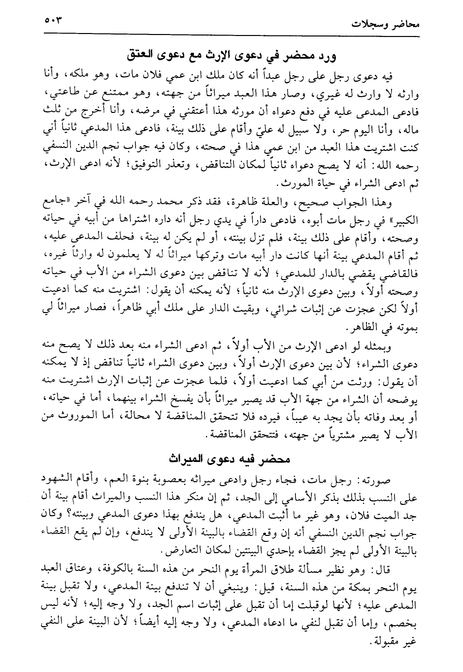 صورته: رجل مات، فجاء رجل وادعى ميراثه بعصوبة بنوة العم، وأقام الشهود على النسب بذلك بذكر الأسامي إلى الجد، ثم إن منكر هذا النسب والميراث أقام بينة أن جد الميت فلان، وهو غير ما أثبت المدعي، هل يندفع بهذا دعوى المدعي وبينته؟ وكان جواب نجم الدين النسفي أنه إن وقع القضاء بالبينة الأولى لا يندفع، وإن لم يقع القضاء بالبينة الأولى لم يجز القضاء بإحدي البينتين لمكان التعارض.