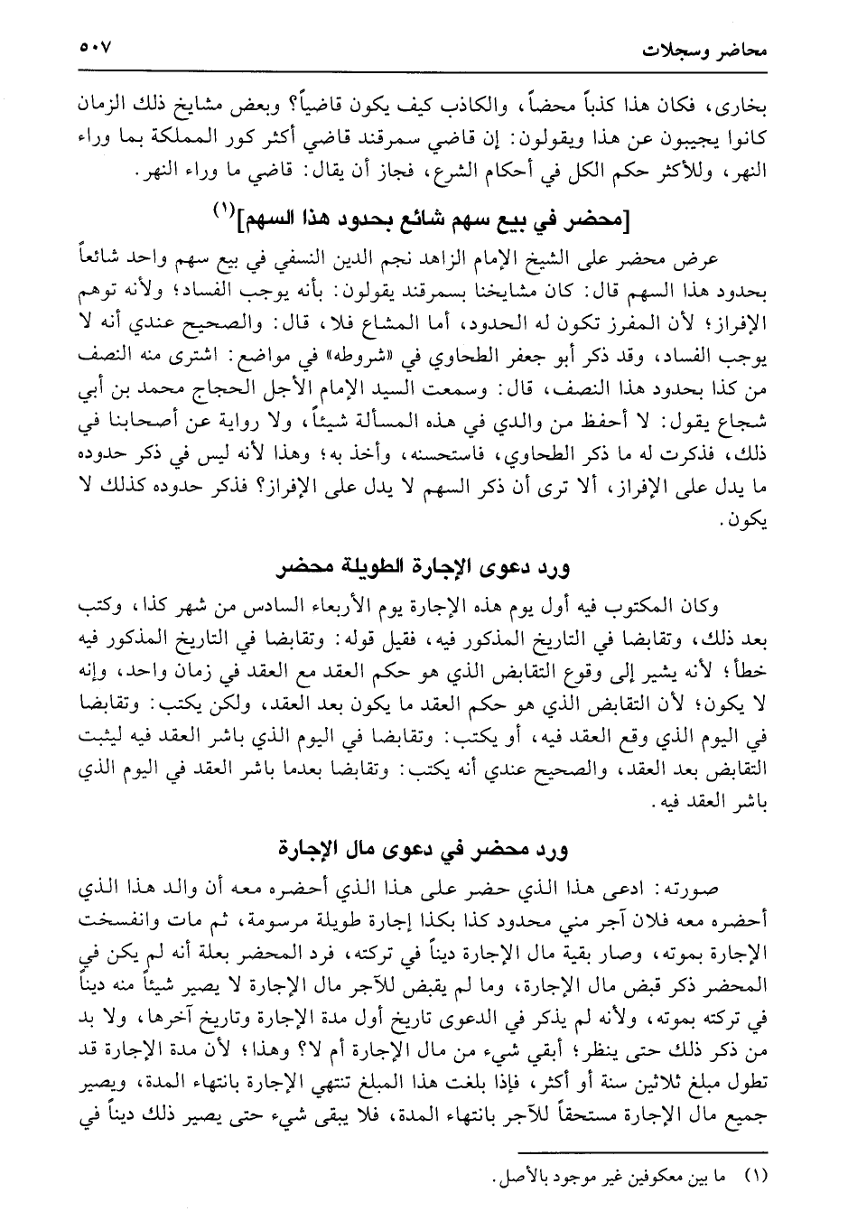عرض محضر على الشيخ الإمام الزاهد نجم الدين النسفي في بيع سهم واحد شائعاً بحدود هذا السهم قال: كان مشايخنا بسمرقند يقولون: بأنه يوجب الفساد؛ ولأنه توهم الإفراز؛ لأن المفرز تكون له الحدود، أما المشاع فلا، قال: والصحيح عندي أنه لا يوجب الفساد، وقد ذكر أبو جعفر الطحاوي في «شروطه» في مواضع: اشترى منه النصف من كذا بحدود هذا النصف، قال: وسمعت السيد الإمام الأجل الحجاج محمد بن أبي شجاع يقول: لا أحفظ من والدي في هذه المسألة شيئاً، ولا رواية عن أصحابنا في ذلك، فذكرت له ما ذكر الطحاوي، فاستحسنه، وأخذ به؛ وهذا لأنه ليس في ذكر حدوده ما يدل على الإفراز، ألا ترى أن ذكر السهم لا يدل على الإفراز؟ فذكر حدوده كذلك لا يكون.