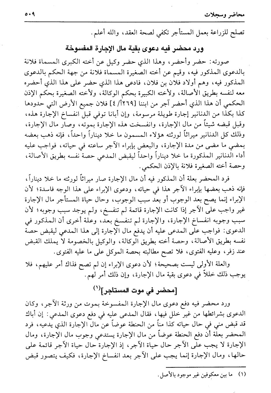 ورد محضر فيه دفع دعوى مال الإجارة المفسوخة بموت من ورثة الآجر، وكان الدعوى بشرائطها من غير خلل فيها، فقال المدعى عليه في دفع دعوى المدعي: إن أباك قد قبض مني في حال حياته كذا مناً من الحنطة عوضاً عن مال الإجارة الذي يدعيه، فرد المحضر بعلة أن دفع الحنطة عوضاً من مال الإجارة يستدعي وجوب مال الإجارة، ومال الإجارة لا يجب على الآجر حال حياة الآجر، إذ الإجارة حال حياة الآجر قائمة على حالها، ومال الإجارة إنما يجب على الآجر بعد انفساخ الإجارة، فكيف يتصور قبض