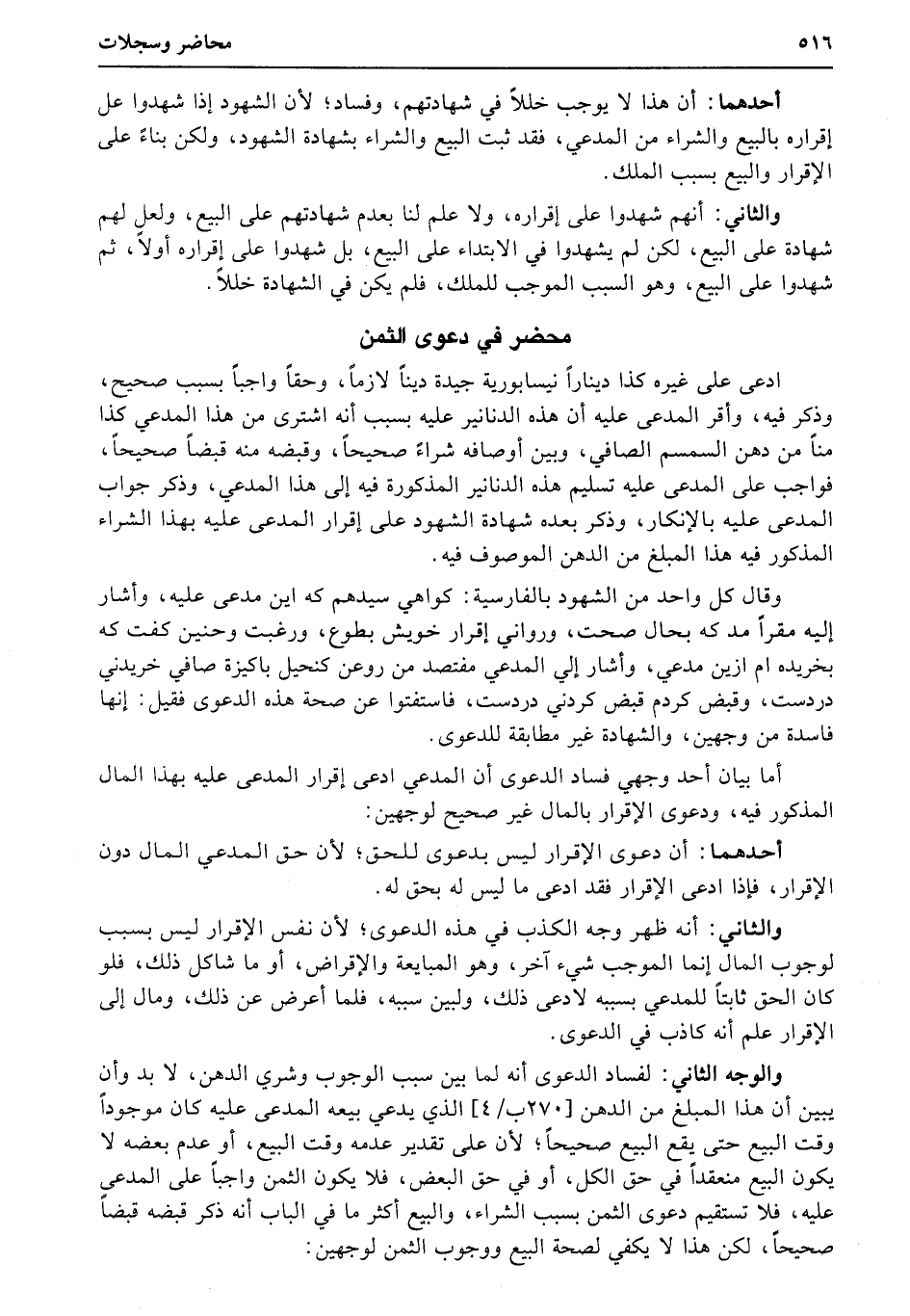 وقال كل واحد من الشهود بالفارسية: كواهي سيدهم كه اين مدعى عليه، وأشار إليه مقراً مد كه بحال صحت، ورواني إقرار خويش بطوع، ورغبت وحنين كفت كه بخريده ام ازين مدعي، وأشار إلي المدعي مفتصد من روعن كنحيل باكيزة صافي خريدني دردست، وقبض كردم قبض كردني دردست، فاستفتوا عن صحة هذه الدعوى فقيل: إنها فاسدة من وجهين، والشهادة غير مطابقة للدعوى.