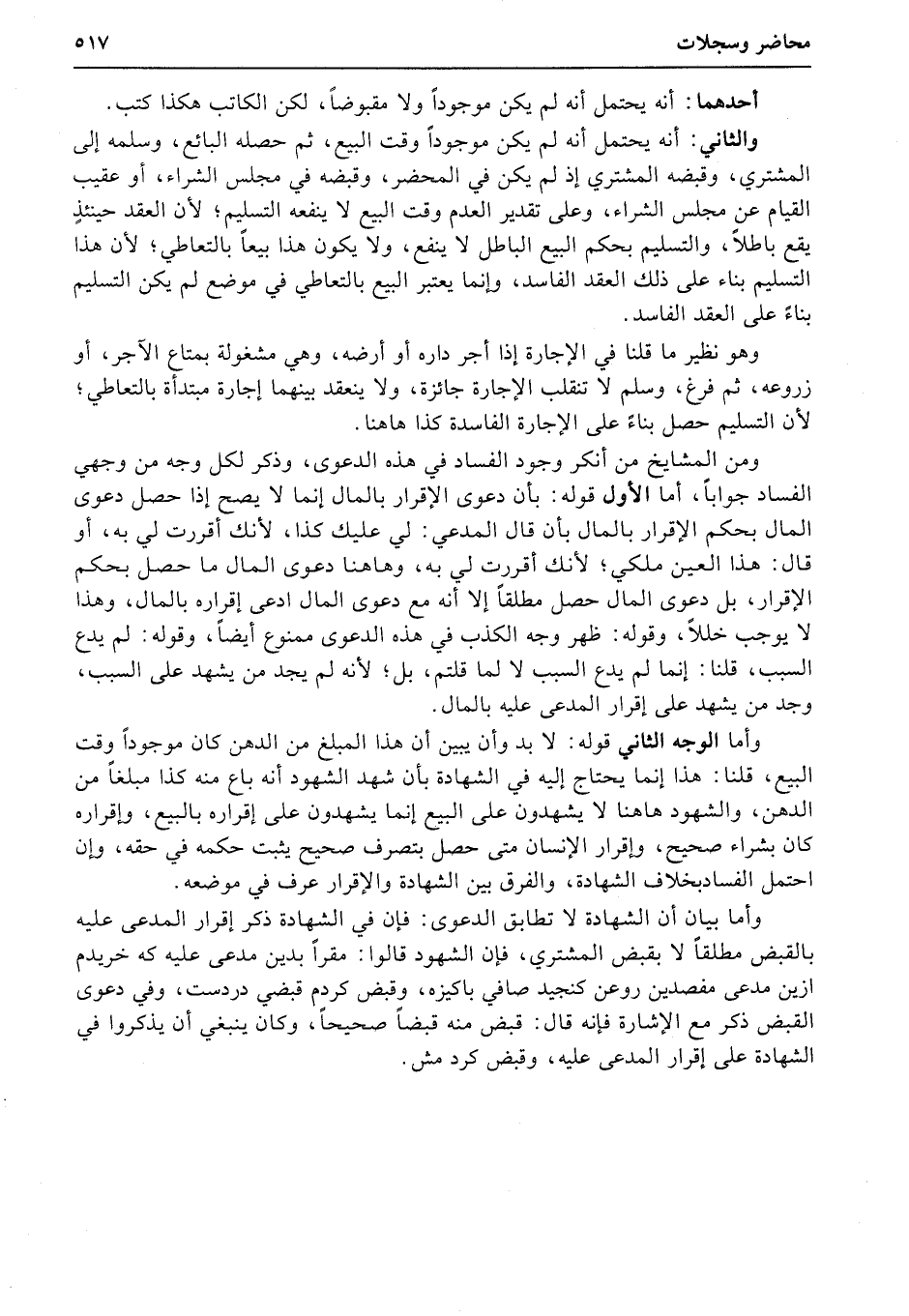 وأما الوجه الثاني قوله: لا بد وأن يبين أن هذا المبلغ من الدهن كان موجوداً وقت البيع، قلنا: هذا إنما يحتاج إليه في الشهادة بأن شهد الشهود أنه باع منه كذا مبلغاً من الدهن، والشهود هاهنا لا يشهدون على البيع إنما يشهدون على إقراره بالبيع، وإقراره كان بشراء صحيح، وإقرار الإنسان متى حصل بتصرف صحيح يثبت حكمه في حقه، وإن احتمل الفسادبخلاف الشهادة، والفرق بين الشهادة والإقرار عرف في موضعه.