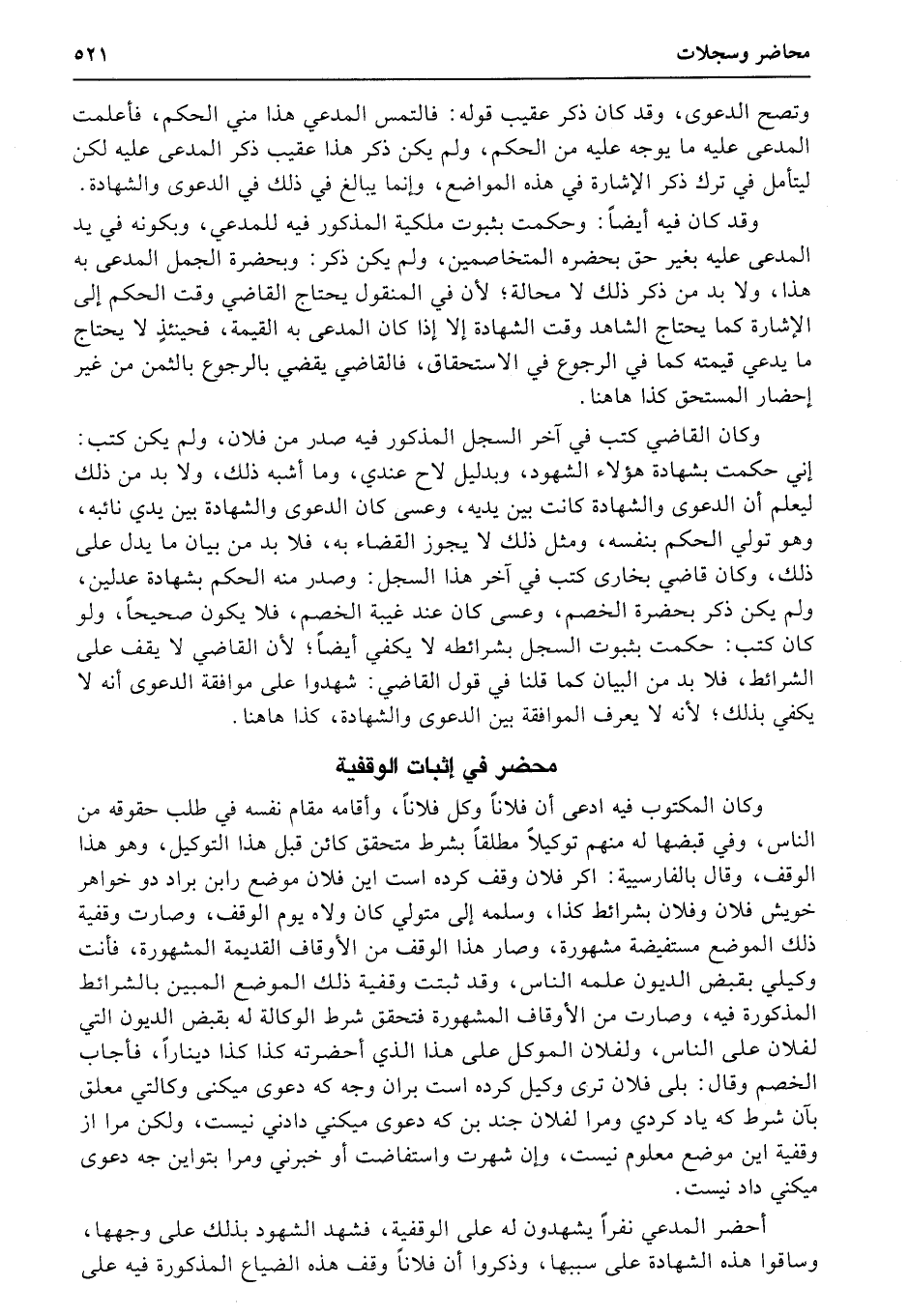 وكان المكتوب فيه ادعى أن فلاناً وكل فلاناً، وأقامه مقام نفسه في طلب حقوقه من الناس، وفي قبضها له منهم توكيلاً مطلقاً بشرط متحقق كائن قبل هذا التوكيل، وهو هذا الوقف، وقال بالفارسيية: اكر فلان وقف كرده است اين فلان موضع رابن براد دو خواهر خويش فلان وفلان بشرائط كذا، وسلمه إلى متولي كان ولاه يوم الوقف، وصارت وقفية ذلك الموضع مستفيضة مشهورة، وصار هذا الوقف من الأوقاف القديمة المشهورة، فأنت وكيلي بقبض الديون علمه الناس، وقد ثبتت وقفية ذلك الموضع المبين بالشرائط المذكورة فيه، وصارت من الأوقاف المشهورة فتحقق شرط الوكالة له بقبض الديون التي لفلان على الناس، ولفلان الموكل على هذا الذي أحضرته كذا كذا ديناراً، فأجاب الخصم وقال: بلى فلان ترى وكيل كرده است بران وجه كه دعوى ميكنى وكالتي معلق بآن شرط كه ياد كردي ومرا لفلان جند بن كه دعوى ميكني دادني نيست، ولكن مرا از وقفية اين موضع معلوم نيست، وإن شهرت واستفاضت أو خبرني ومرا بتواين جه دعوى ميكني داد نيست.