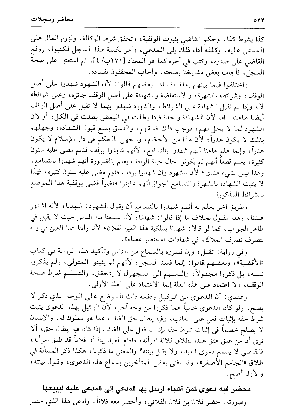 كذا بشرط كذا، وحكم القاضي بثبوت الوقفية، وتحقق شرط الوكالة، ولزوم المال على المدعى عليه، وكلفه أداء ذلك إلى المدعي، وأمر بكتبة هذا السجل فكتبوا، ووقع القاضي على صدره، وكتب في آخره كما هو المعتاد (271ب4) ، ثم استفتوا على صحة السجل، فأجاب بعض مشايخنا بصحته، وأجاب المحققون بفساده.