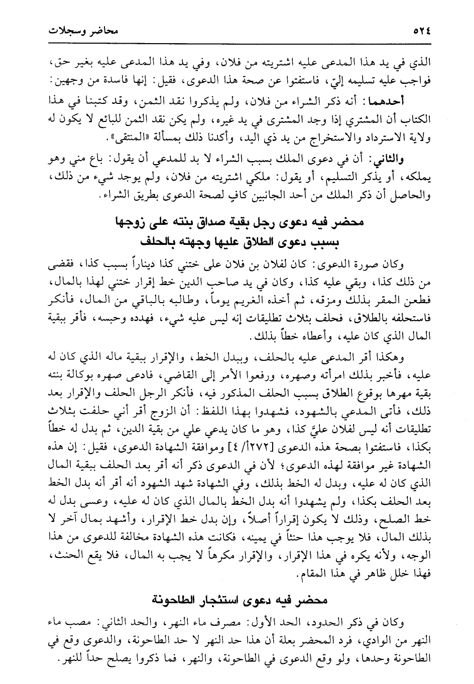 وكان في ذكر الحدود، الحد الأول: مصرف ماء النهر، والحد الثاني: مصب ماء النهر من الوادي، فرد المحضر بعلة أن هذا حد النهر لا حد الطاحونة، والدعوى وقع في الطاحونة وحدها، ولو وقع الدعوى في الطاحونة، والنهر، فما ذكروا يصلح حداً للنهر.
