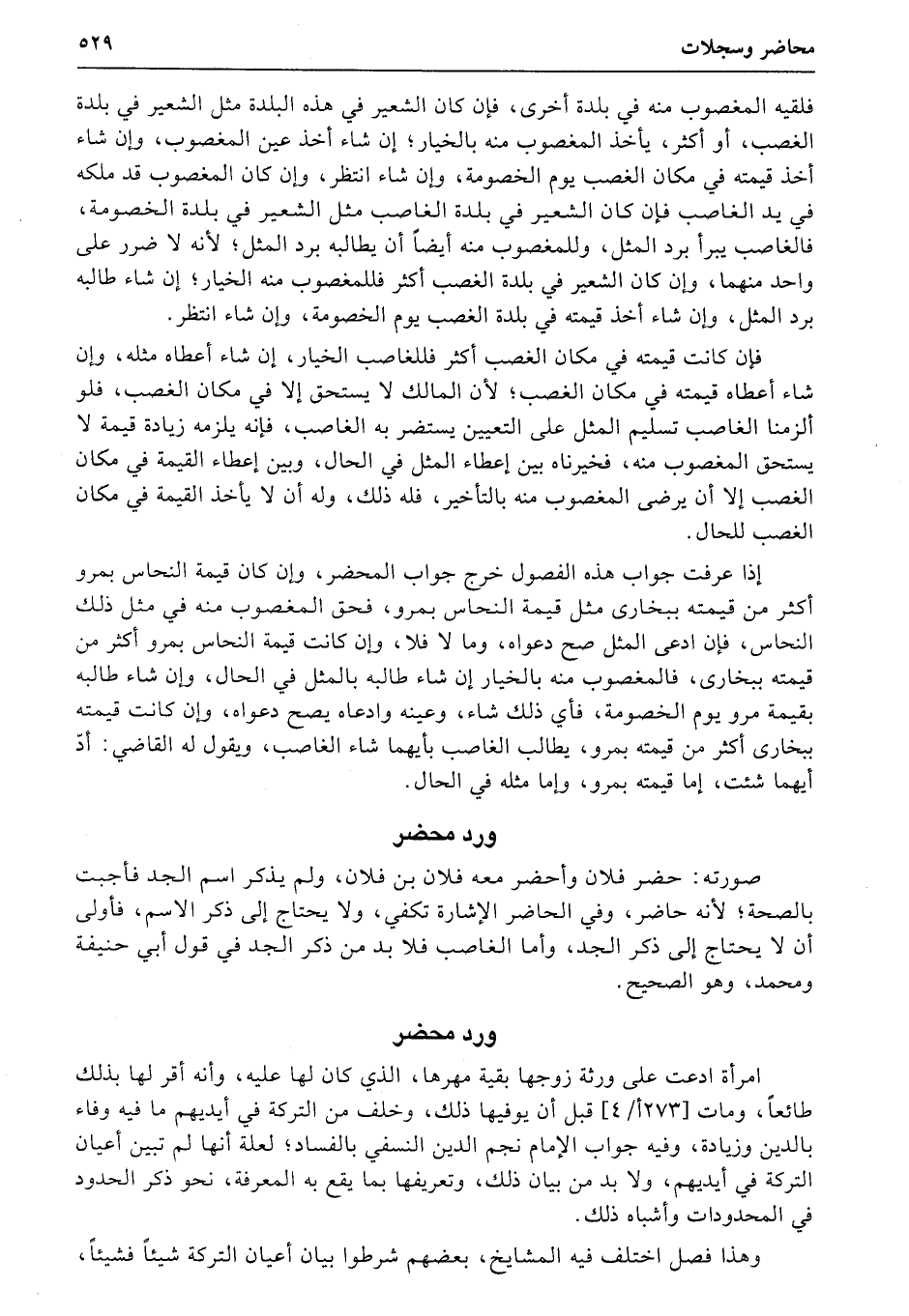 إذا عرفت جواب هذه الفصول خرج جواب المحضر، وإن كان قيمة النحاس بمرو أكثر من قيمته ببخارى مثل قيمة النحاس بمرو، فحق المغصوب منه في مثل ذلك النحاس، فإن ادعى المثل صح دعواه، وما لا فلا، وإن كانت قيمة النحاس بمرو أكثر من قيمته ببخارى، فالمغصوب منه بالخيار إن شاء طالبه بالمثل في الحال، وإن شاء طالبه بقيمة مرو يوم الخصومة، فأي ذلك شاء، وعينه وادعاه يصح دعواه، وإن كانت قيمته ببخارى أكثر من قيمته بمرو، يطالب الغاصب بأيهما شاء الغاصب، ويقول له القاضي: أدّ أيهما شئت، إما قيمته بمرو، وإما مثله في الحال.