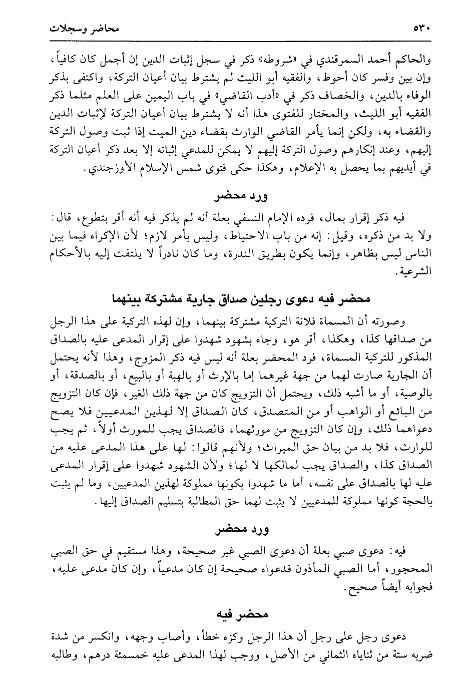 والحاكم أحمد السمرقندي في «شروطه» ذكر في سجل إثبات الدين إن أجمل كان كافياً، وإن بين وفسر كان أحوط، والفقيه أبو الليث لم يشترط بيان أعيان التركة، واكتفى بذكر الوفاء بالدين، والخصاف ذكر في «أدب القاضي» في باب اليمين على العلم مثلما ذكر الفقيه أبو الليث، والمختار للفتوى هذا أنه لا يشترط بيان أعيان التركة لإثبات الدين والقضاء به، ولكن إنما يأمر القاضي الوارث بقضاء دين الميت إذا ثبت وصول التركة إليهم، وعند إنكارهم وصول التركة إليهم لا يمكن للمدعي إثباته إلا بعد ذكر أعيان التركة في أيديهم بما يحصل به الإعلام، وهكذا حكى فتوى شمس الإسلام الأوزجندي.