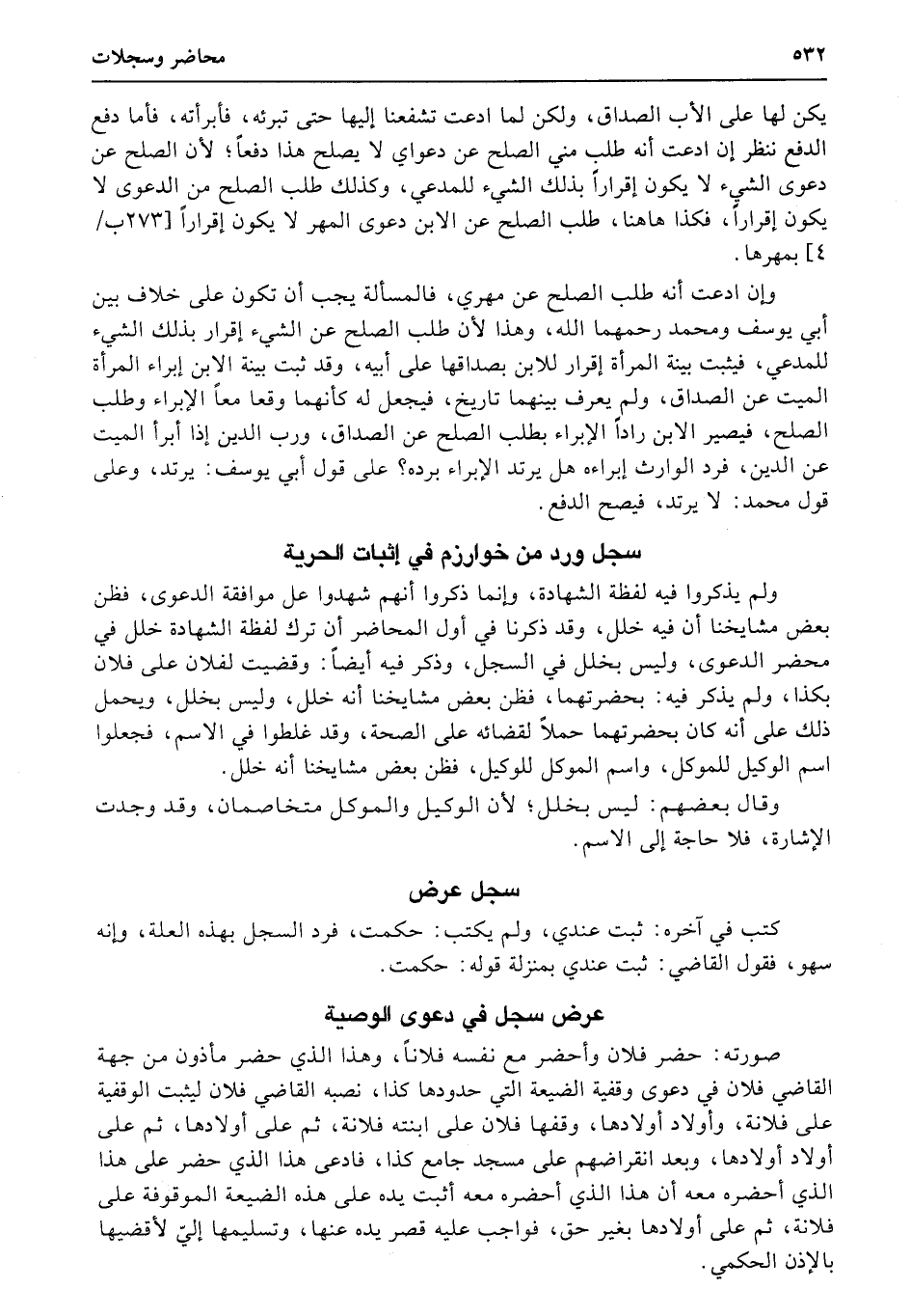 ولم يذكروا فيه لفظة الشهادة، وإنما ذكروا أنهم شهدوا عل موافقة الدعوى، فظن بعض مشايخنا أن فيه خلل، وقد ذكرنا في أول المحاضر أن ترك لفظة الشهادة خلل في محضر الدعوى، وليس بخلل في السجل، وذكر فيه أيضاً: وقضيت لفلان على فلان بكذا، ولم يذكر فيه: بحضرتهما، فظن بعض مشايخنا أنه خلل، وليس بخلل، ويحمل ذلك على أنه كان بحضرتهما حملاً لقضائه على الصحة، وقد غلطوا في الاسم، فجعلوا اسم الوكيل للموكل، واسم الموكل للوكيل، فظن بعض مشايخنا أنه خلل.