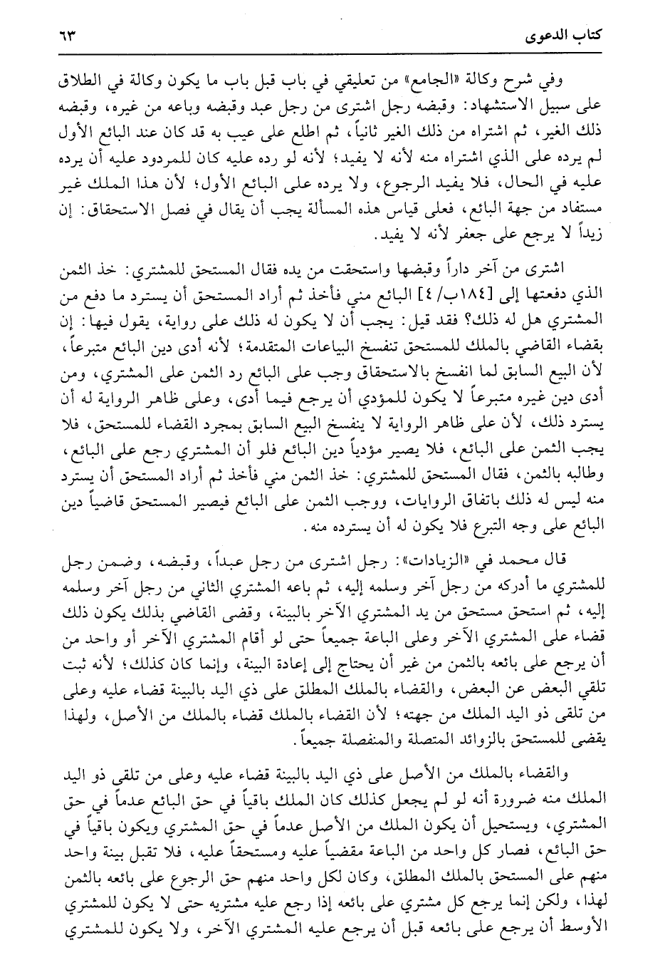 وفي شرح وكالة «الجامع» من تعليقي في باب قبل باب ما يكون وكالة في الطلاق على سبيل الاستشهاد: وقبضه رجل اشترى من رجل عبد وقبضه وباعه من غيره، وقبضه ذلك الغير، ثم اشتراه من ذلك الغير ثانياً، ثم اطلع على عيب به قد كان عند البائع الأول لم يرده على الذي اشتراه منه لأنه لا يفيد؛ لأنه لو رده عليه كان للمردود عليه أن يرده عليه في الحال، فلا يفيد الرجوع، ولا يرده على البائع الأول؛ لأن هذا الملك غير مستفاد من جهة البائع، فعلى قياس هذه المسألة يجب أن يقال في فصل الاستحقاق: إن زيداً لا يرجع على جعفر لأنه لا يفيد.