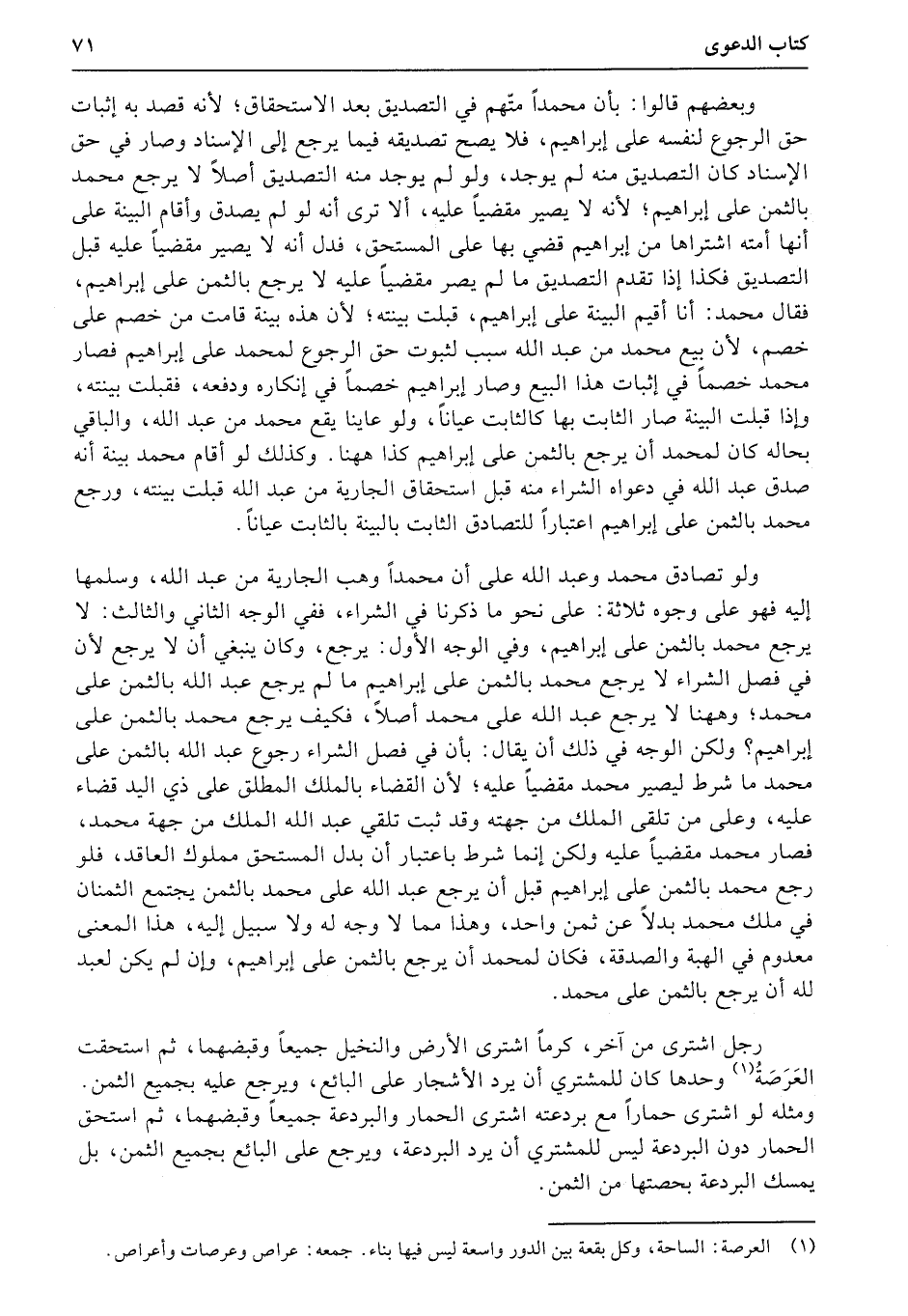 رجل اشترى من آخر، كرماً اشترى الأرض والنخيل جميعاً وقبضهما، ثم استحقت العَرَصَةُ وحدها كان للمشتري أن يرد الأشجار على البائع، ويرجع عليه بجميع الثمن. ومثله لو اشترى حماراً مع بردعته اشترى الحمار والبردعة جميعاً وقبضهما، ثم استحق الحمار دون البردعة ليس للمشتري أن يرد البردعة، ويرجع على البائع بجميع الثمن، بل يمسك البردعة بحصتها من الثمن.