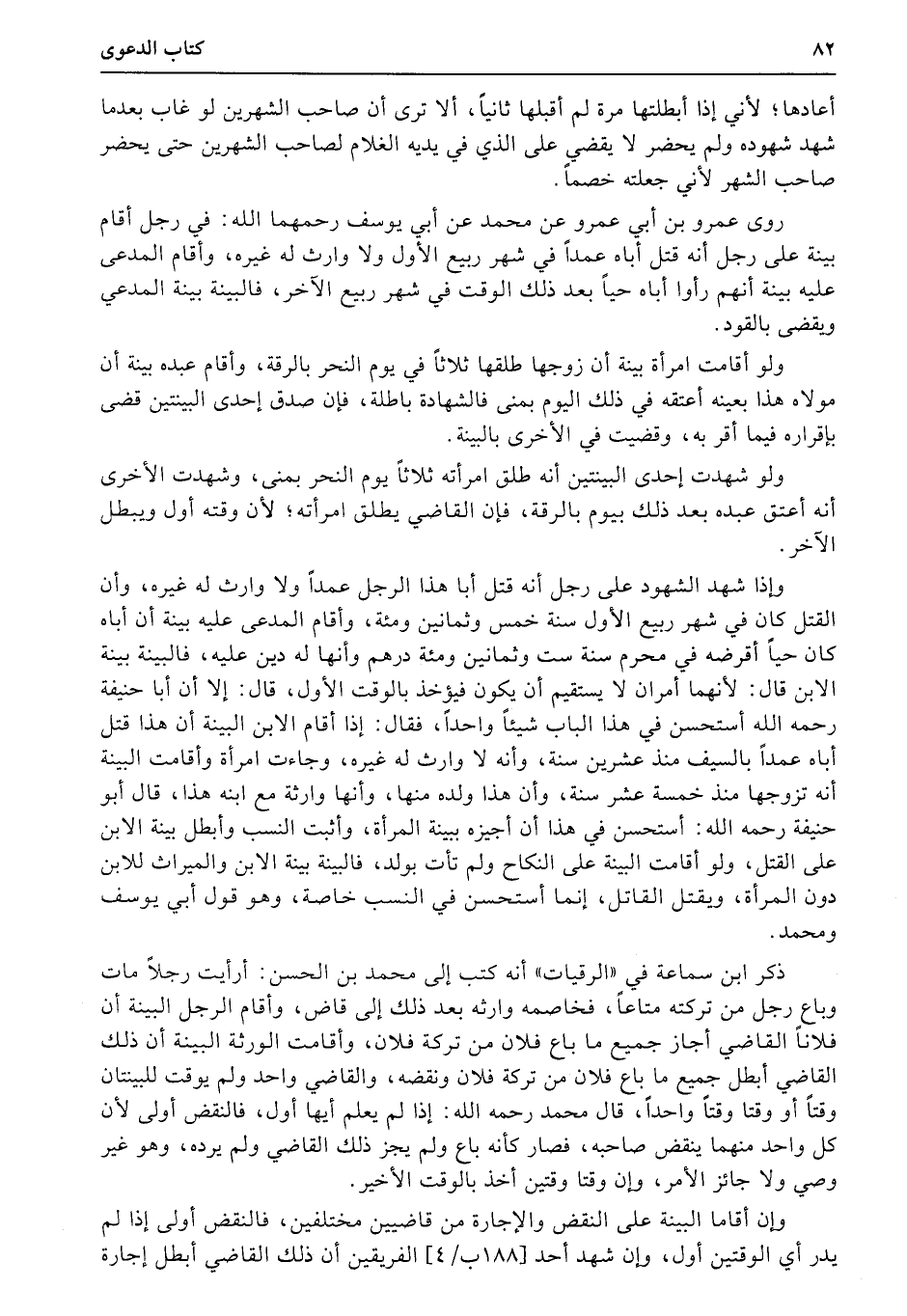 وإذا شهد الشهود على رجل أنه قتل أبا هذا الرجل عمداً ولا وارث له غيره، وأن القتل كان في شهر ربيع الأول سنة خمس وثمانين ومئة، وأقام المدعى عليه بينة أن أباه كان حياً أقرضه في محرم سنة ست وثمانين ومئة درهم وأنها له دين عليه، فالبينة بينة الابن قال: لأنهما أمران لا يستقيم أن يكون فيؤخذ بالوقت الأول، قال: إلا أن أبا حنيفة رحمه الله أستحسن في هذا الباب شيئاً واحداً، فقال: إذا أقام الابن البينة أن هذا قتل أباه عمداً بالسيف منذ عشرين سنة، وأنه لا وارث له غيره، وجاءت امرأة وأقامت البينة أنه تزوجها منذ خمسة عشر سنة، وأن هذا ولده منها، وأنها وارثة مع ابنه هذا، قال أبو حنيفة رحمه الله: أستحسن في هذا أن أجيزه ببينة المرأة، وأثبت النسب وأبطل بينة الابن على القتل، ولو أقامت البينة على النكاح ولم تأت بولد، فالبينة بينة الابن والميراث للابن دون المرأة، ويقتل القاتل، إنما أستحسن في النسب خاصة، وهو قول أبي يوسف ومحمد.