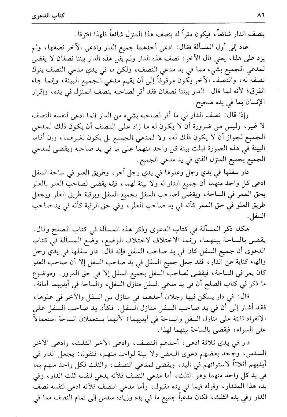 هكذا ذكر المسألة في كتاب الدعوى وذكر هذه المسألة في كتاب الصلح وقال: يقضى بالساحة بينهما، وإنما الاختلاف لاختلاف الوضع، وضع المسألة في كتاب الدعوى أن جميع السفل كان في يد صاحب السفل فإنه قال: دار سفلها في يدي رجل والهاء كناية عن الدار، فقد جعل جميع السفل في يد صاحب السفل إلا أن صاحب العلو كان يمر في الساحة، فيقضى لصاحب السفل بجميع السفل إلا في حق المرور. وموضوع ما ذكر في كتاب الصلح أن في يد مدعي السفل منازل السفل، والساحة في أيديهما أمانة.