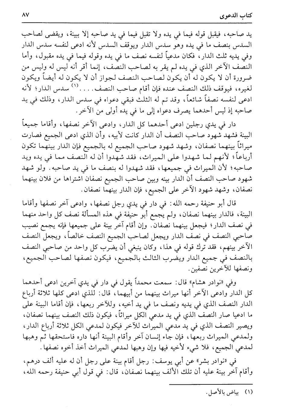دار في يدي رجلين ادعى أحدهما كل الدار، وادعى الآخر نصفها، وأقاما جميعاً البينة فشهد شهود صاحب النصف أن الدار كانت لأبيه، وأن الذي ادعى الجميع فصارت ميراثاً بينهما نصفان، وشهد شهود صاحب الجميع له بالجميع فإن الدار بينهما تكون أرباعاً؛ لأنهم لما شهدوا على الميراث، فقد شهدوا أن له النصف مما في يده ويد صاحبه؛ لأن الميراث في جميعها، فقد شهدوا له بنصف ما في يد صاحبه.