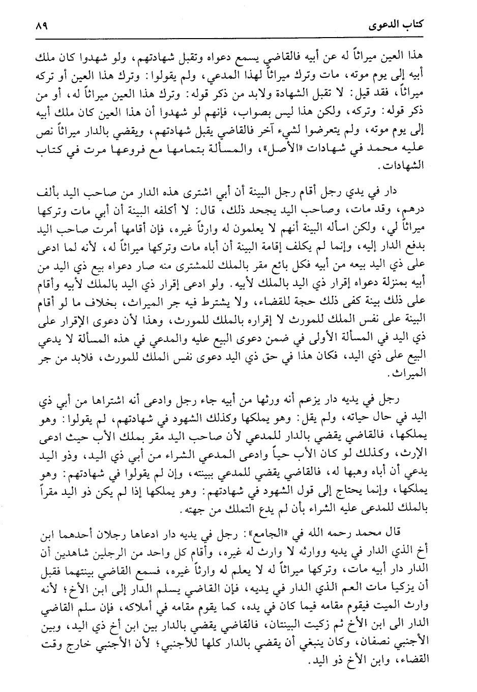 دار في يدي رجل أقام رجل البينة أن أبي اشترى هذه الدار من صاحب اليد بألف درهم، وقد مات، وصاحب اليد يجحد ذلك، قال: لا أكلفه البينة أن أبي مات وتركها ميراثاً لي، ولكن اسأله البينة أنهم لا يعلمون له وارثاً غيره، فإن أقامها أمرت صاحب اليد بدفع الدار إليه، وإنما لم يكلف إقامة البينة أن أباه مات وتركها ميراثاً له، لأنه لما ادعى على ذي اليد بيعه من أبيه فكل بائع مقر بالملك للمشترى منه صار دعواه بيع ذي اليد من أبيه بمنزلة دعواه إقرار ذي اليد بالملك لأبيه.