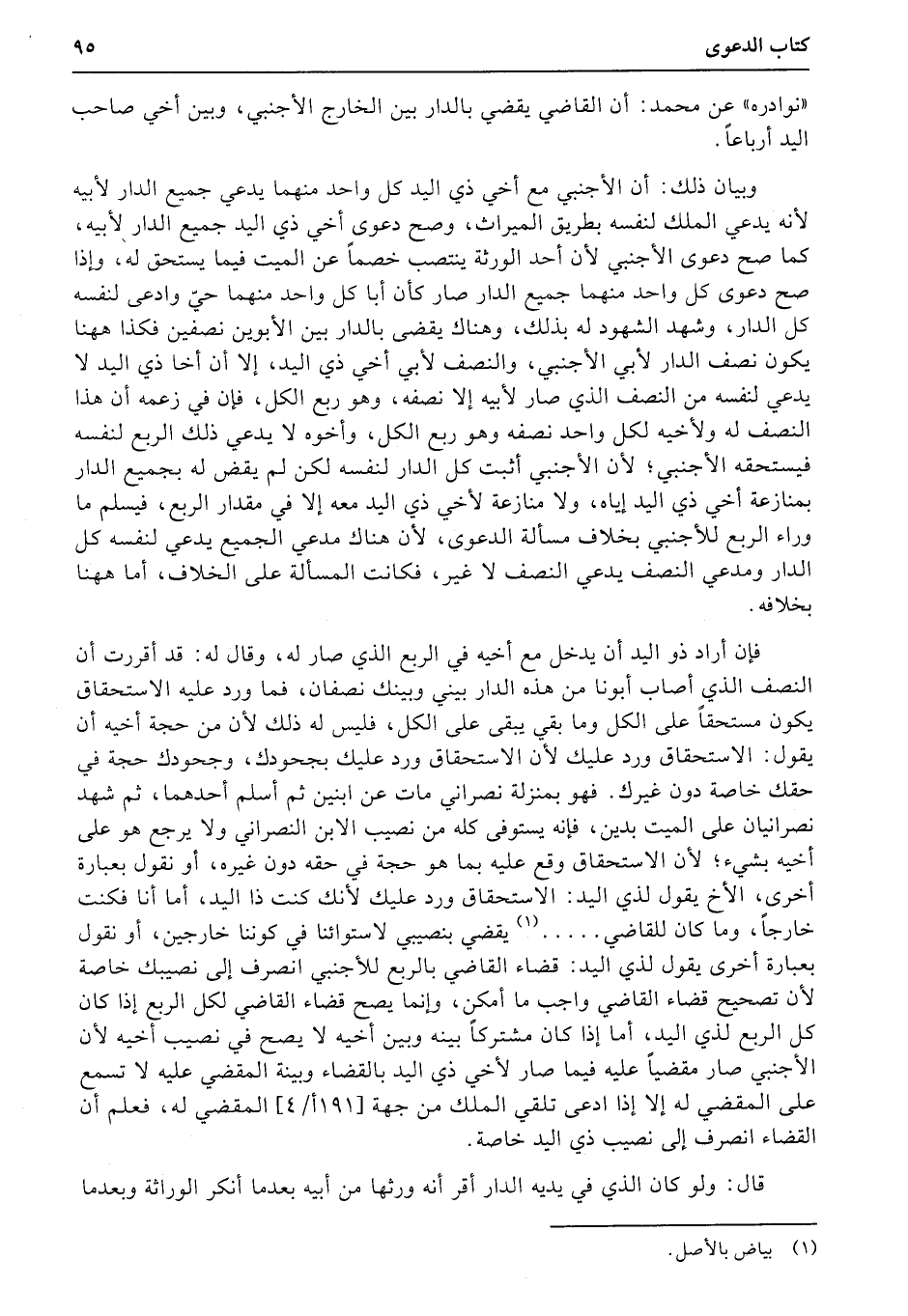 «نوادره» عن محمد: أن القاضي يقضي بالدار بين الخارج الأجنبي، وبين أخي صاحب اليد أرباعاً.