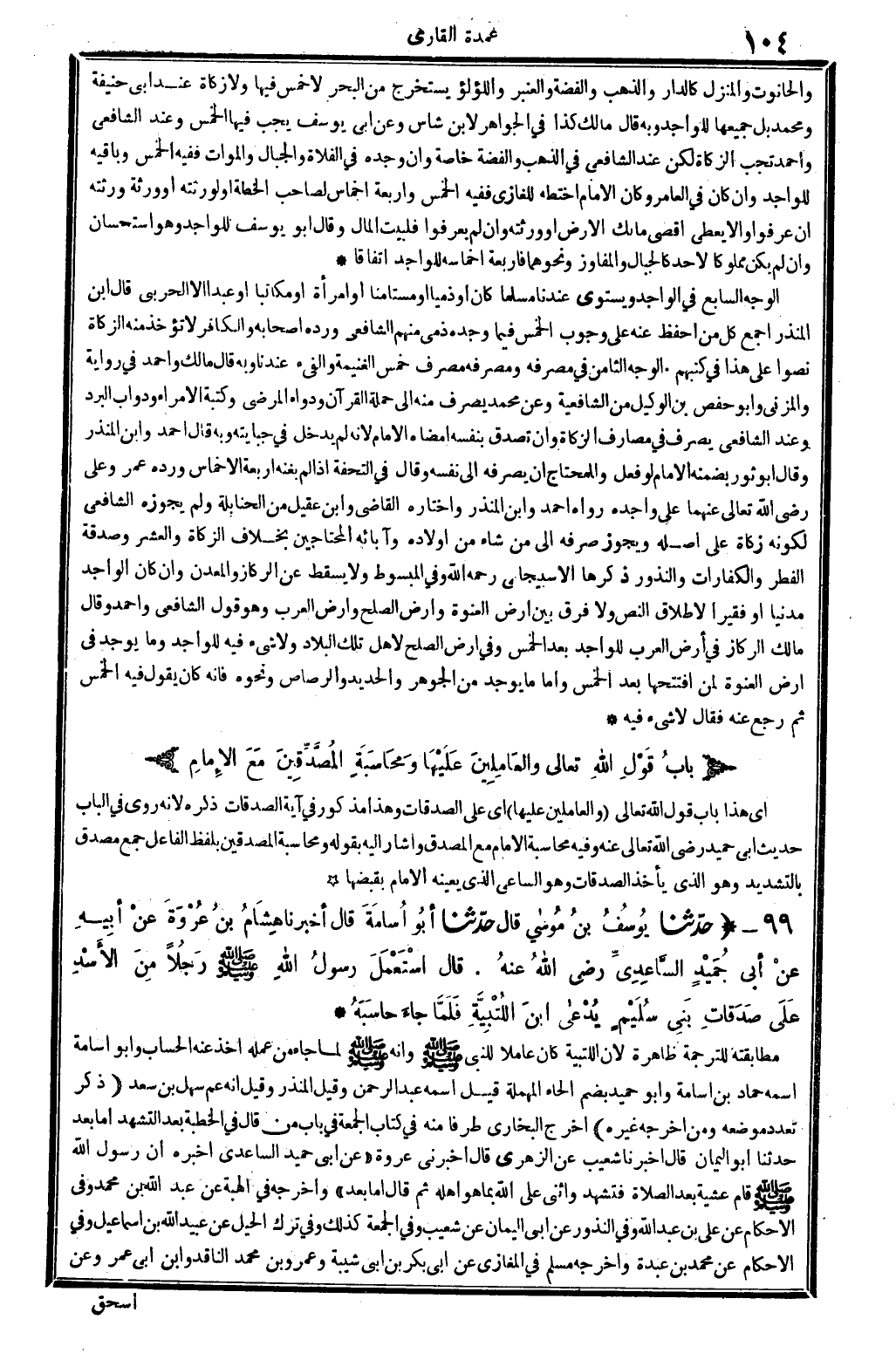 0051 - حدَّثنا يُوسُفُ بنُ مُوسى اقال حدَّثنا أبُو أُسَامَةَ قَالَ أخبرنَا هِشَامُ بنُ عُرْوَةَ عنْ أبِيهِ عنْ أبِي حُمَيْدٍ السَّاعِدِيِّ رَضِي الله تَعَالَى عنهُ. قَالَ اسْتَعْمَلَ رسولُ الله صلى الله عَلَيْهِ وَسلم رَجُلاً مِنَ الأَسْدِ عَلَى صَدَقَاتِ بَنِي سُلَيْمٍ يُدْعى ابنَ اللُتْبِيَّةَ فلَمَّا جَاءَ حاسَبَهُ..