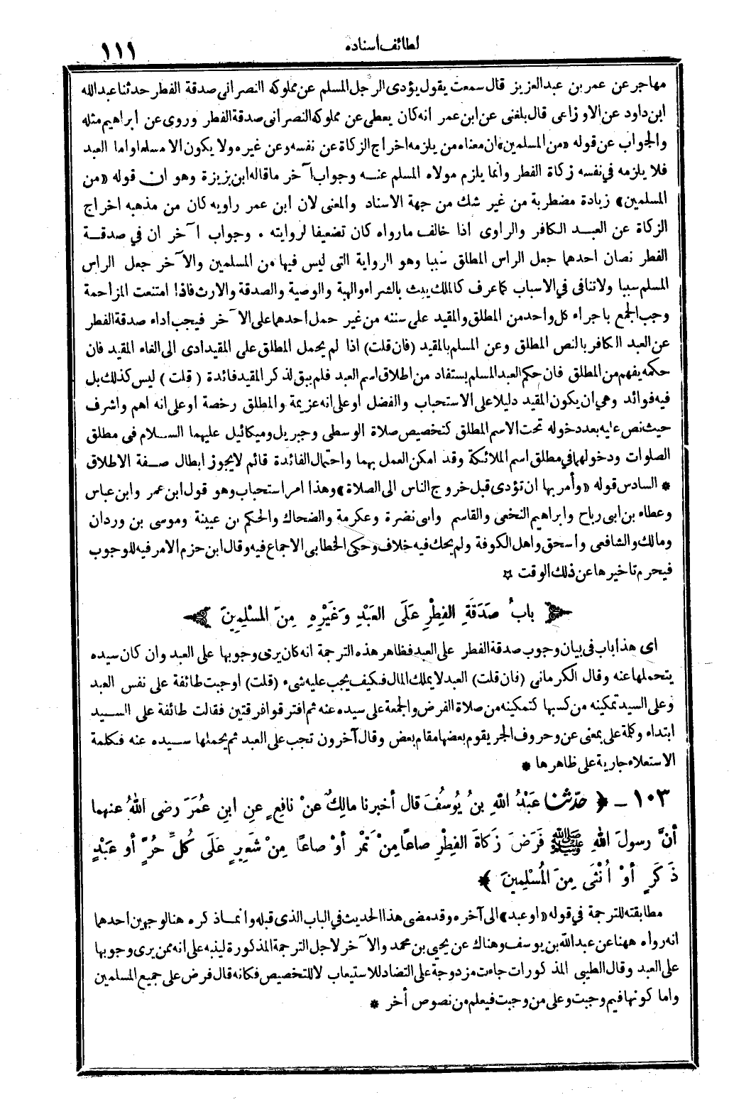 مهَاجر عَن عمر بن عبد الْعَزِيز، قَالَ: سمعته يَقُول: يُؤَدِّي الرجل الْمُسلم عَن مَمْلُوكه النَّصْرَانِي صَدَقَة الْفطر، حَدثنَا عبد الله ابْن دَاوُد عَن الْأَوْزَاعِيّ، قَالَ: بَلغنِي عَن ابْن عمر أَنه كَانَ يُعْطي عَن مَمْلُوكه النَّصْرَانِي صَدَقَة الْفطر، وروى عَن إِبْرَاهِيم مثله، وَالْجَوَاب عَن قَوْله: (من الْمُسلمين) أَن مَعْنَاهُ من يلْزمه إِخْرَاج الزَّكَاة عَن نَفسه وَعَن غَيره، وَلَا يكون إلاَّ مُسلما. وَأما العَبْد فَلَا يلْزمه فِي نَفسه زَكَاة الْفطر، وَإِنَّمَا يلْزم مَوْلَاهُ الْمُسلم عَنهُ. وَجَوَاب آخر: مَا قَالَه ابْن بزيزة، وَهُوَ: إِن قَوْله: (من الْمُسلمين) زِيَادَة مضطربة من غير شكّ من جِهَة الْإِسْنَاد، وَالْمعْنَى: لِأَن ابْن عمر رَاوِيه كَانَ من مذْهبه إِخْرَاج الزَّكَاة عَن العَبْد الْكَافِر، والراوي إِذا خَالف مَا رَوَاهُ كَانَ تضعيفا لروايته. وَجَوَاب آخر: أَن فِي صَدَقَة الْفطر نصان: أَحدهمَا: جعل الرَّأْس الْمُطلق سَببا، وَهُوَ الرِّوَايَة الَّتِي لَيْسَ فِيهَا: من الْمُسلمين. وَالْآخر: جعل الرَّأْس الْمُسلم سَببا، وَلَا تنَافِي فِي الْأَسْبَاب كَمَا عرف كالملك يبث بِالشِّرَاءِ وَالْهِبَة وَالْوَصِيَّة وَالصَّدَََقَة وَالْإِرْث فَإِذا امْتنعت المزاجمة وَجب الْجمع بإجراء كل وَاحِد من الْمُطلق والمقيد على سنَنه من غير حمل أَحدهمَا على الآخر، فَيجب أَدَاء صَدَقَة الْفطر عَن العَبْد الْكَافِر بِالنَّصِّ الْمُطلق وَعَن الْمُسلم بالمقيد. فَإِن قلت: إِذا لم يحمل الْمُطلق على الْمُقَيد أدّى إِلَى إِلْغَاء الْمُقَيد، فَإِن حكمه يفهم من الْمُطلق، فَإِن حكم العَبْد الْمُسلم يُسْتَفَاد من إِطْلَاق إسم العَبْد فَلم يبْق لذكر الْمُقَيد فَائِدَة؟ قلت: لَيْسَ كَذَلِك، بل فِيهِ فَوَائِد، وَهِي: أَن يكون الْمُقَيد دَلِيلا على الِاسْتِحْبَاب وَالْفضل، أَو على أَنه عَزِيمَة وَالْمُطلق رخصَة، أَو على أَنه أهم وأشرف حَيْثُ نَص عَلَيْهِ بعد دُخُوله تَحت الِاسْم الْمُطلق، كتخصيص صَلَاة الْوُسْطَى وَجِبْرِيل وَمِيكَائِيل، عَلَيْهِمَا السَّلَام، فِي مُطلق الصَّلَوَات، ودخولهما فِي مُطلق اسْم الْمَلَائِكَة، وَقد أمكن الْعَمَل بهما. وَاحْتِمَال الْفَائِدَة قَائِم لَا يجوز إبِْطَال صفة الْإِطْلَاق.