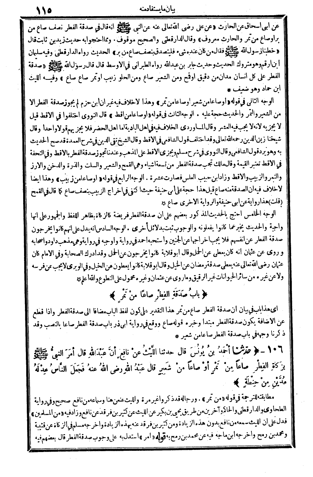 عَن أبي إِسْحَاق عَن الْحَارِث (عَن عَليّ، رَضِي الله تَعَالَى عَنهُ، عَن النَّبِي صلى الله عَلَيْهِ وَسلم أَنه قَالَ: فِي صَدَقَة الْفطر نصف صَاع من بر أَو صَاع من تمر والْحَارث مَعْرُوف) . وَقَالَ الدَّارَقُطْنِيّ: وَالصَّحِيح مَوْقُوف. وَمِمَّا احْتَجُّوا بِهِ فِي حَدِيث زيد بن ثَابت قَالَ: (خَطَبنَا رَسُول الله صلى الله عَلَيْهِ وَسلم فَقَالَ: من كَانَ عِنْده شَيْء فليتصدق بِنصْف صَاع من بر. .) الحَدِيث، رَوَاهُ الدَّارَقُطْنِيّ، وَفِيه سُلَيْمَان ابْن أَرقم وَهُوَ مَتْرُوك الحَدِيث، وَحَدِيث جَابر بن عبد الله رَوَاهُ الطَّبَرَانِيّ فِي (الْأَوْسَط) قَالَ: قَالَ رَسُول الله صلى الله عَلَيْهِ وَسلم: (صَدَقَة الْفطر على كل إِنْسَان مدّان من دَقِيق أَو قَمح، وَمن الشّعير صَاع، وَمن الحلو زبيب أَو تمر صَاع صَاع) . وَفِيه اللَّيْث ابْن حَمَّاد وَهُوَ ضَعِيف.