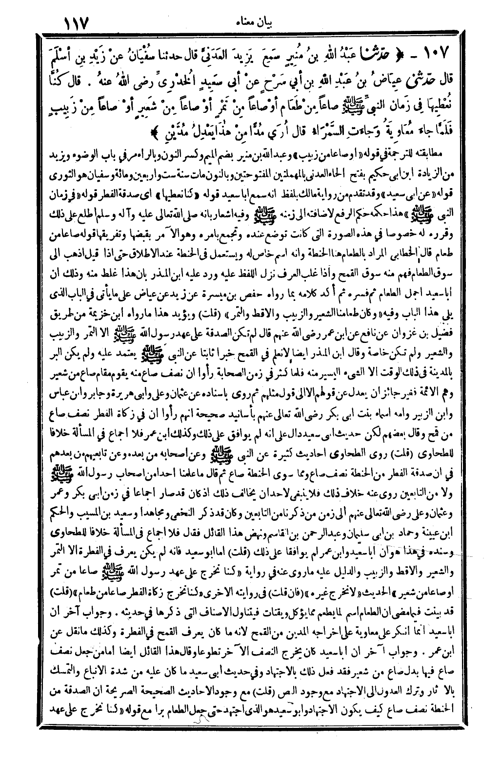 8051 - حدَّثنا عَبْدُ الله بنُ مُنِيرٍ سَمِعَ يَزيدَ العَدَنِيِّ قَالَ حدَّثنا سُفْيانُ عنْ زَيْدِ بنِ أسْلَمَ قَالَ حدَّثني عِيَاضُ بنُ عَبْدِ الله بنِ أبي سَرْحٍ عنْ أبي سَعِيدٍ الخُدْرِي رَضِي الله تَعَالَى عَنهُ. قَالَ كُنَّا نُعْطِيهَا فِي زَمَانِ النبيِّ صلى الله عَلَيْهِ وَسلم صَاعا مِنْ طَعَام أوْ صَاعا مِنْ تَمْرٍ أَو صَاعا مِنْ شَعِيرٍ أوْ صَاعا مِنْ زَبِيبٍ فَلَمَّا جاءَ مُعَاوِيَةُ وَجاءَتِ السَّمْرَاءُ قَالَ أُرَي مُدَّا مِنْ هاذا يَعْدِلُ مُدَّيْنِ.