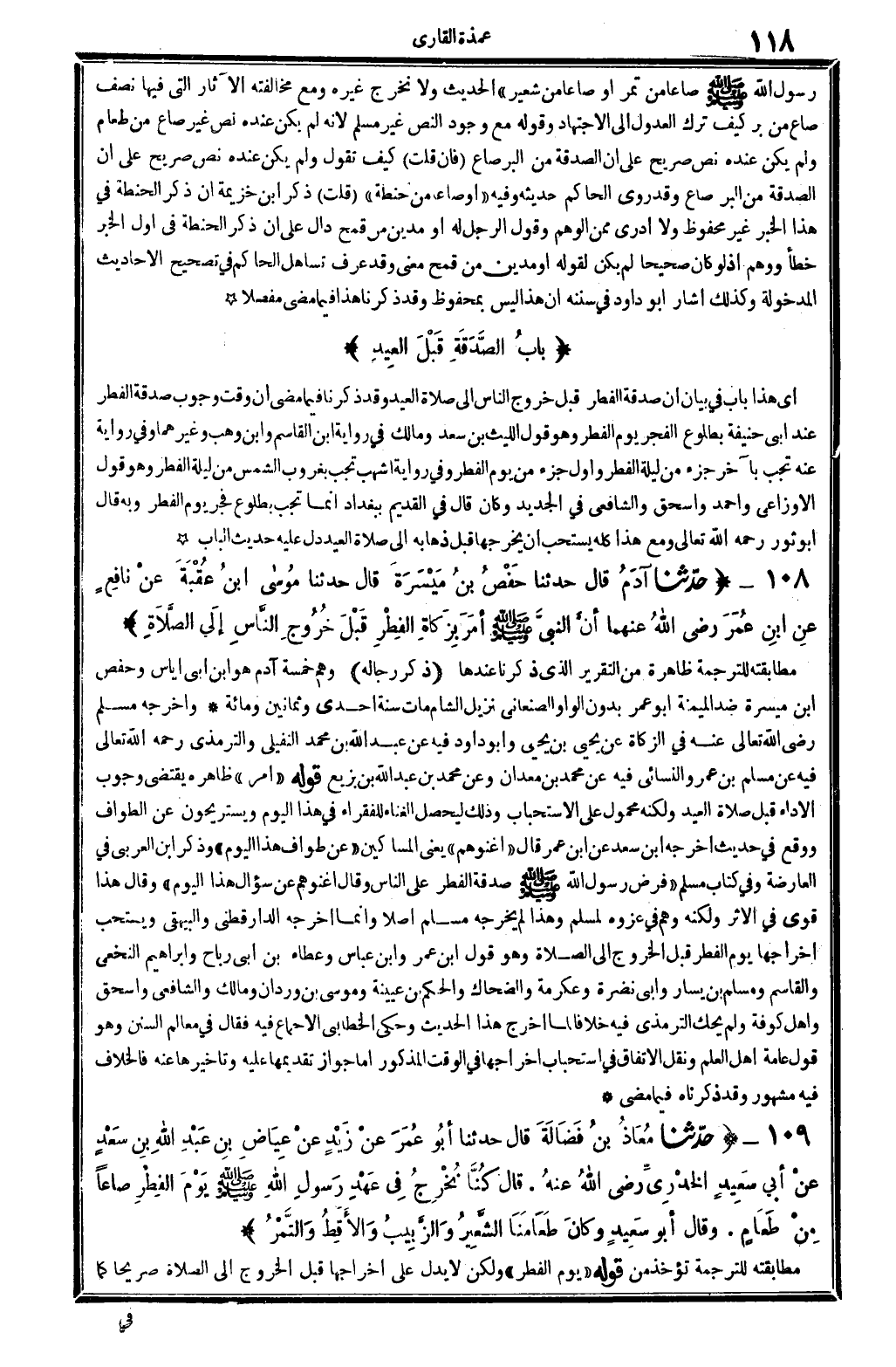 رَسُول الله صلى الله عَلَيْهِ وَسلم صَاعا من تمر أَو صَاعا من شعير) الحَدِيث، (لَا نخرج غَيره) فَإِن قلت: فِي رِوَايَته الْأُخْرَى: (كُنَّا نخرج زَكَاة الْفطر صَاعا من طَعَام؟) قلت: قد بيّنت فِيمَا مضى أَن الطَّعَام اسْم لما يطعم مِمَّا يُؤْكَل ويقتات، فَيتَنَاوَل الْأَصْنَاف الَّتِي ذكرهَا فِي حَدِيثه. وَجَوَاب آخر: أَن أَبَا سعيد إِنَّمَا أنكر على مُعَاوِيَة على إِخْرَاجه الْمَدِين من الْقَمْح لِأَنَّهُ مَا كَانَ يعرف الْقَمْح فِي الْفطْرَة، وَكَذَلِكَ مَا نقل عَن ابْن عمر. وَجَوَاب آخر: أَن أَبَا سعيد كَانَ يخرج النّصْف الآخر تَطَوّعا، وَقَالَ هَذَا الْقَائِل أَيْضا: أما من جعل نصف صَاع فِيهَا بدل صَاع من شعير فقد فعل ذَلِك بِالِاجْتِهَادِ، وَفِي حَدِيث أبي سعيد مَا كَانَ عَلَيْهِ من شدَّة الإتباع والتمسك بالآثار وَترك الْعُدُول إِلَى الِاجْتِهَاد مَعَ وجود النَّص. قلت: مَعَ وجود الْأَحَادِيث الصَّحِيحَة الصَّرِيحَة أَن الصَّدَقَة من الْحِنْطَة نصف صَاع، كَيفَ يكون الِاجْتِهَاد؟ وَأَبُو سعيد هُوَ الَّذِي اجْتهد حَتَّى جعل الطَّعَام برا، مَعَ قَوْله: (كُنَّا نخرج على عهد رَسُول الله صلى الله عَلَيْهِ وَسلم صَاعا من تمر أَو صَاعا من شعير. .) الحَدِيث، وَلَا نخرج غَيره، وَمَعَ مُخَالفَته الْآثَار الَّتِي فِيهَا نصف صَاع من بر، كَيفَ ترك الْعُدُول إِلَى الِاجْتِهَاد؟ وَقَوله: مَعَ وجود النَّص غير مُسلم، لِأَنَّهُ لم يكن عِنْده نَص غير صَاع من طَعَام، وَلم يكن عِنْده نَص صَرِيح على أَن الصَّدَقَة من الْبر صَاع؟ فَإِن قلت: كَيفَ تَقول: وَلم يكن عِنْده نَص صَرِيح على أَن الصَّدَقَة من الْبر صَاع؟ وَقد روى الْحَاكِم حَدِيثه، وَفِيه: (أَو صَاعا من حِنْطَة؟) قلت: ذكر ابْن خُزَيْمَة أَن ذكر الْحِنْطَة فِي هَذَا الْخَبَر غير مَحْفُوظ، وَلَا أَدْرِي مِمَّن الْوَهم. وَقَول الرجل لَهُ: أَو مَدين من قَمح، دَال على أَن ذكر الْحِنْطَة فِي أول الْخَبَر خطأ وَوهم، إِذْ لَو كَانَ صَحِيحا لم يكن لقَوْله: أَو مَدين من قَمح، معنى. وَقد عرف تساهل الْحَاكِم فِي تَصْحِيح الْأَحَادِيث المدخولة، وَكَذَلِكَ أَشَارَ أَبُو دَاوُد فِي (سنَنه) أَن هَذَا لَيْسَ بِمَحْفُوظ، وَقد ذكرنَا هَذَا فِيمَا مضى مفصلا.